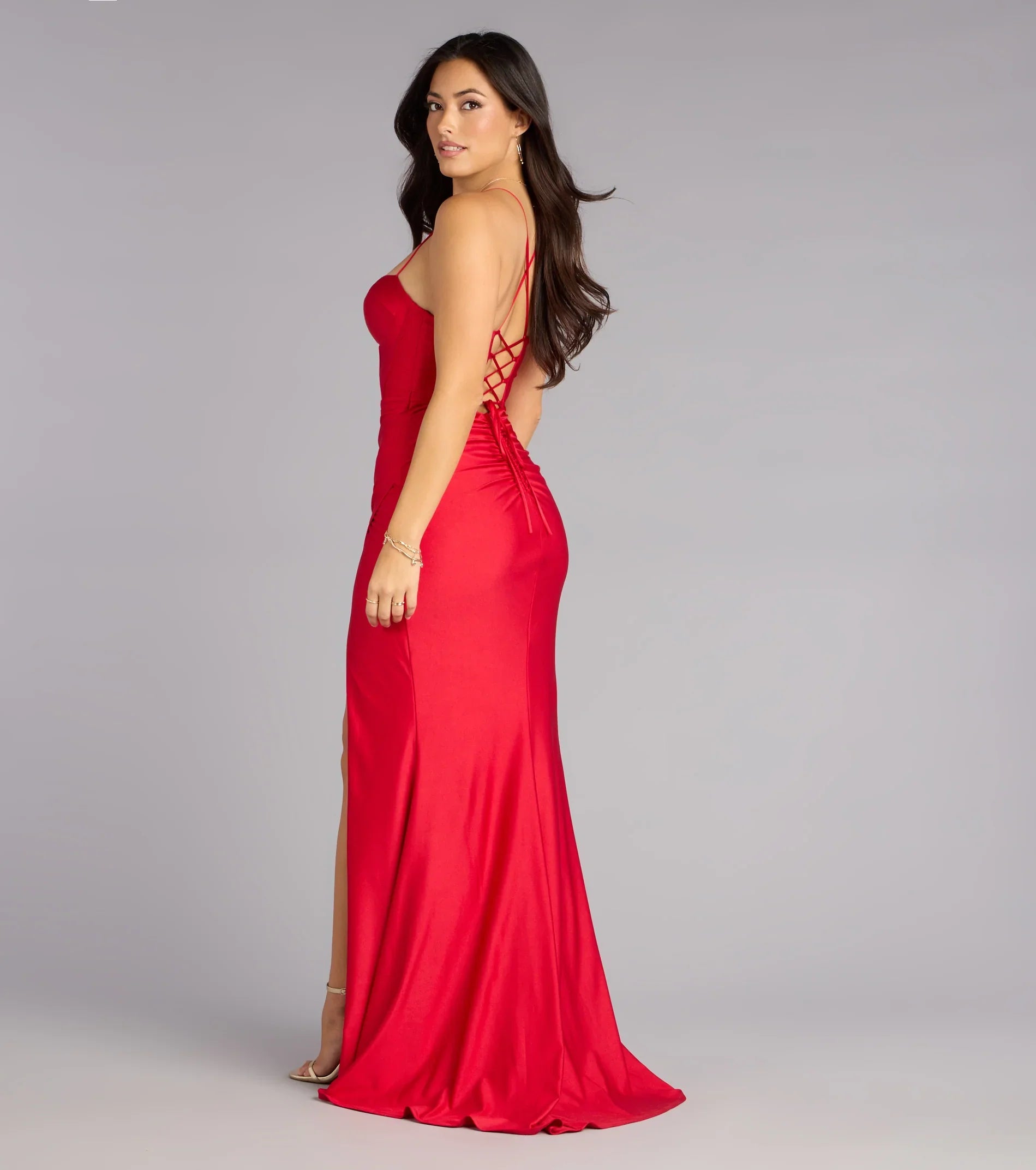 Designed for the one who owns every entrance, the Aliana formal dress slips through the room in smooth knit with a corset-inspired bodice that sculpts effortlessly. The mermaid silhouette, lace-up back, and high slit create a look that’s sleek, chic, and impossible to overlook.