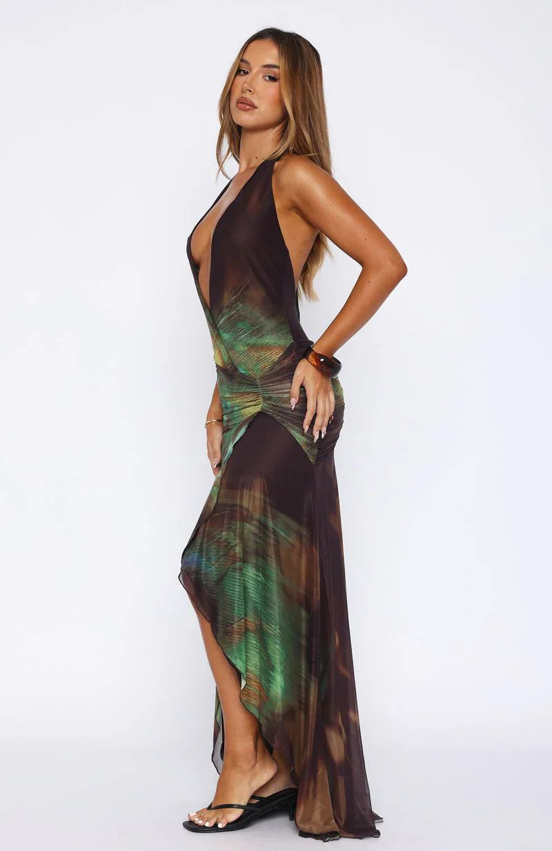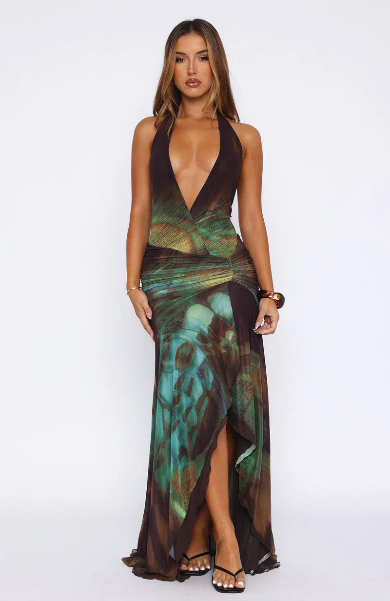 The All I See Is You Maxi Halter Dress Butterfly Dreams will have you radiating confidence! Featuring a halter neck design with back self tie strap, an ultra low plunge neckline, backless, maxi length, and side front split design with frill detailing. Pair with high shine accessories and a fresh tan!