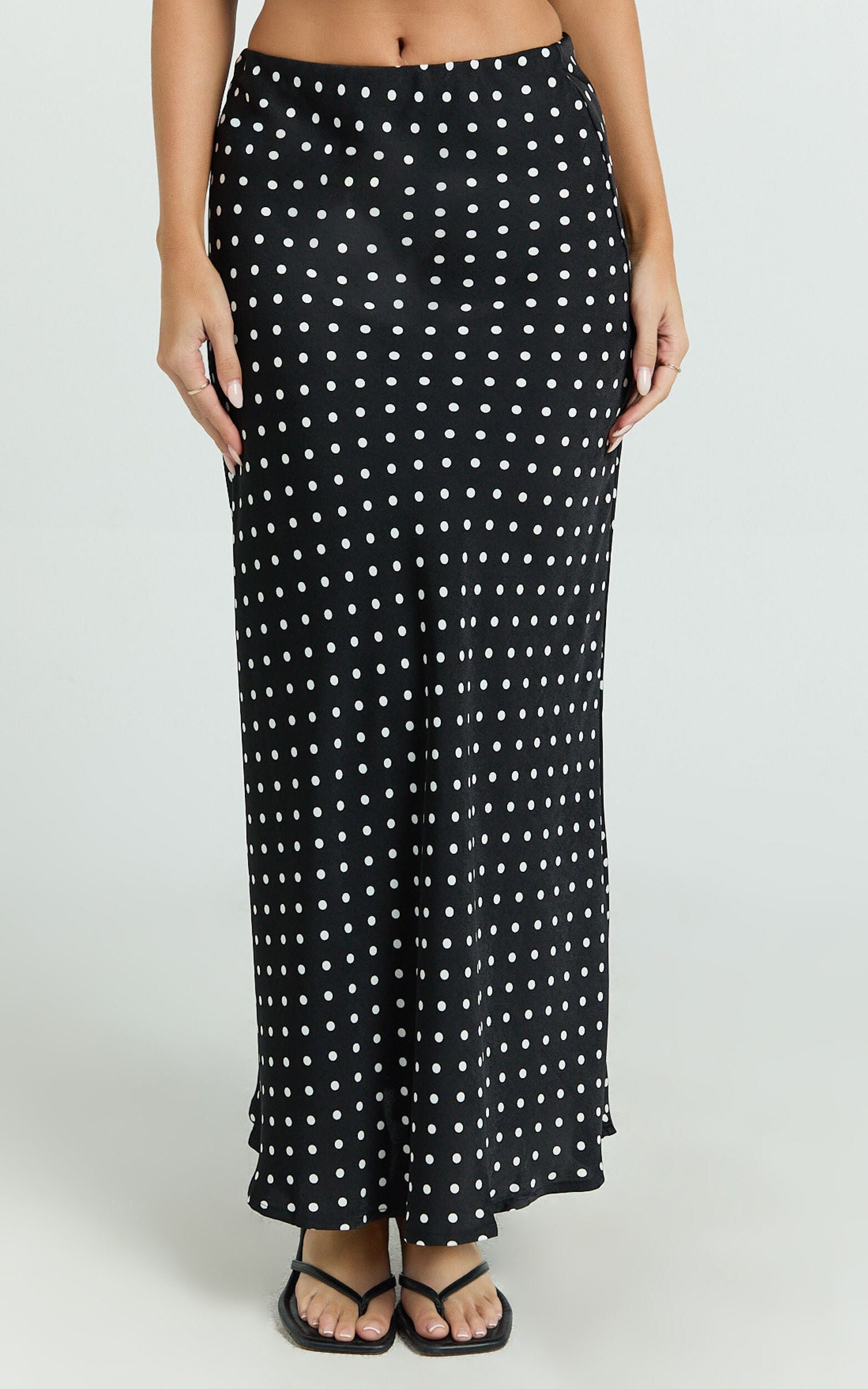 Meet your new closet crush: the Amari Maxi Skirt ??High Waisted Bias Cut Skirt in Black Polka Dot. This flirty maxi is all about twirling through your day with confidence. Designed in a silky satin finish, this slip skirt sits high on the waist, skimming your curves for that effortlessly chic silhouette Gen Z and Millennials are obsessed with. It��s crafted from luxe polyester, so it��s lightweight, comfy, and perfect for casual brunch dates or dressed-up nights out.
