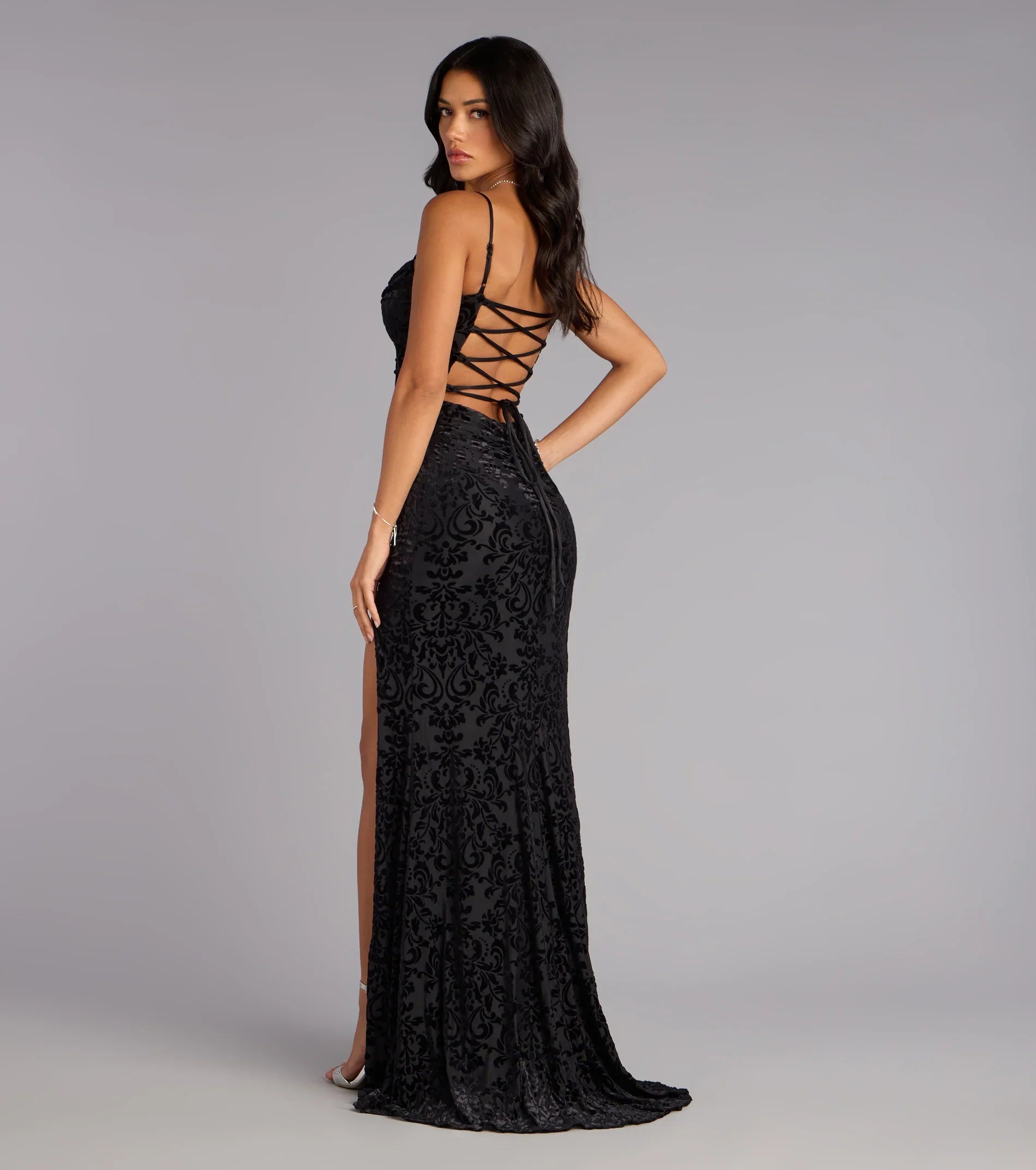 A gown designed to steal the spotlight, the Ashlie velvet burnout mermaid dress drapes in a soft cowl neckline and flows into a high front slit that moves with every step. The lace-up open back adds the perfect balance of allure and drama.