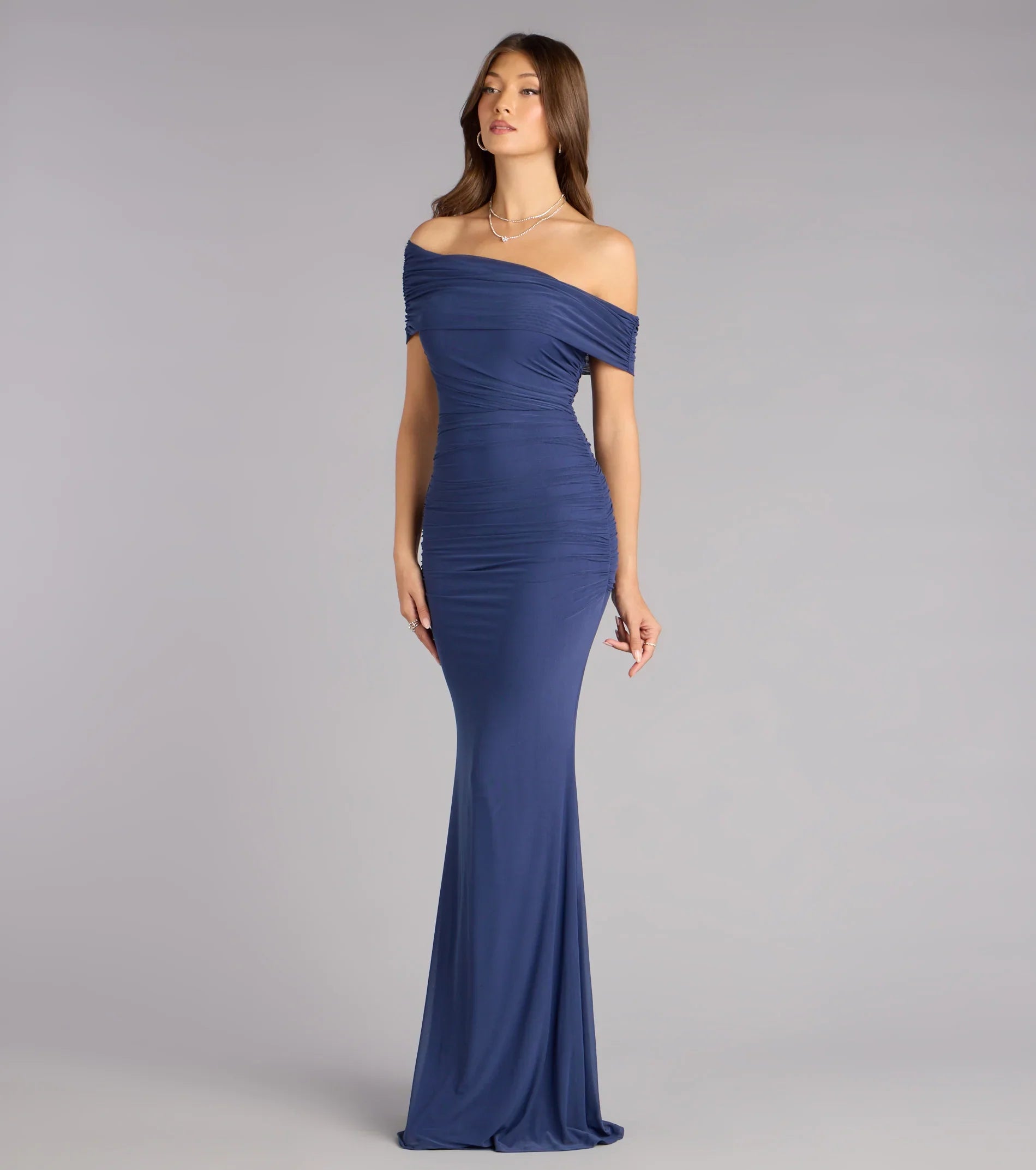 Stand out with confidence and grace in the Ashlynn mesh formal dress! Featuring a striking off-shoulder neckline and elegant side ruched seams, this floor-length gown sculpts your silhouette with a flattering mermaid fit.