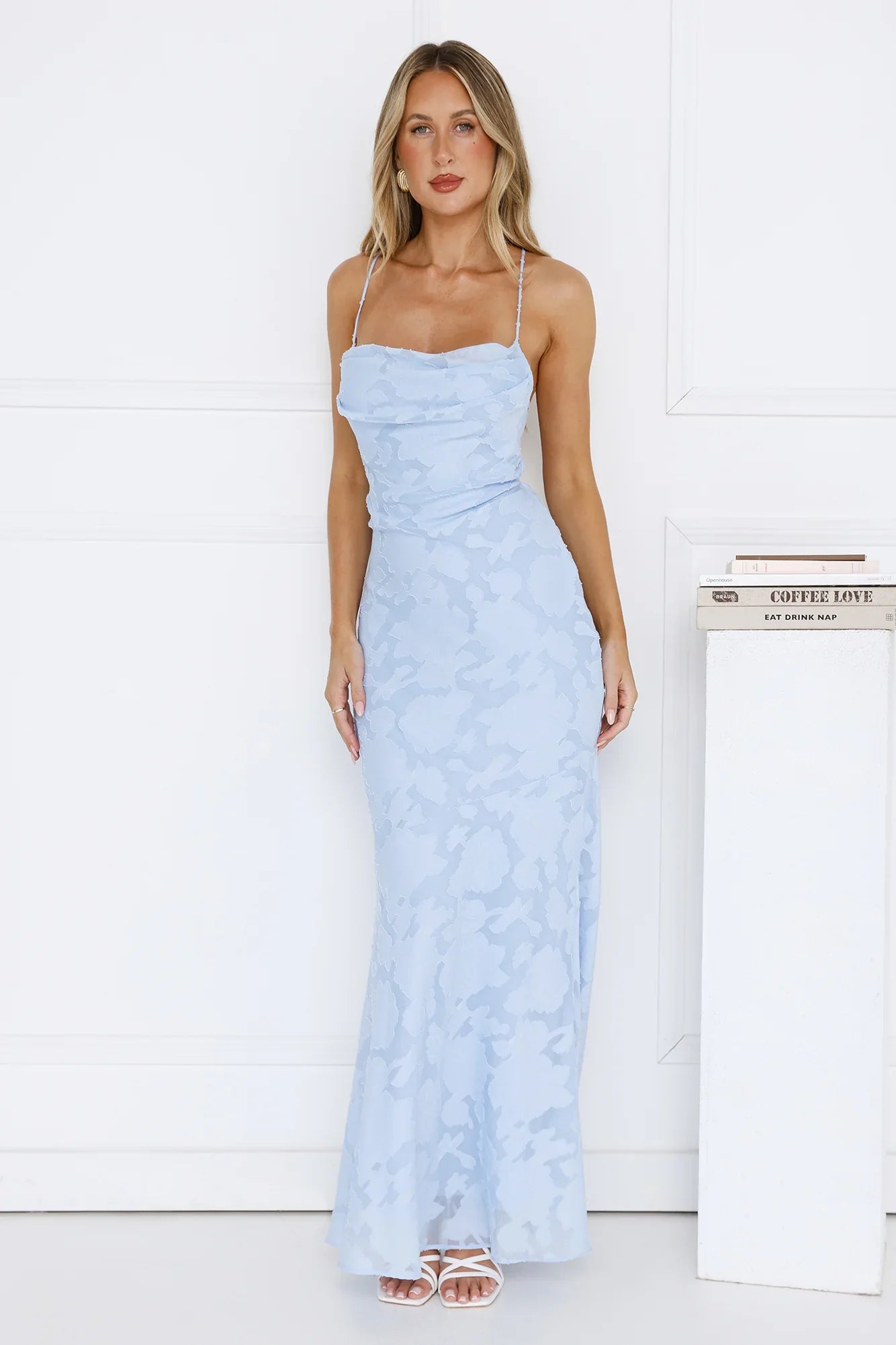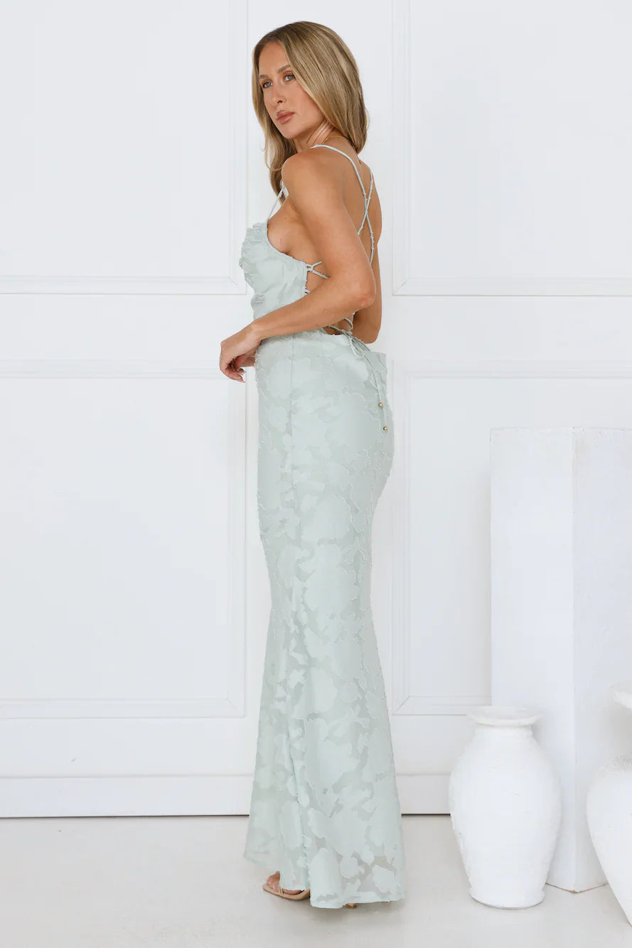 The Bridge To Wonderland Maxi Dress features a textured design fabric, a subtle cowl neck, and a crisscross back. Pair it with delicate heels and a clutch for an elegant, dreamy vibe.
