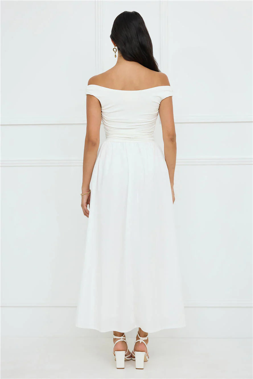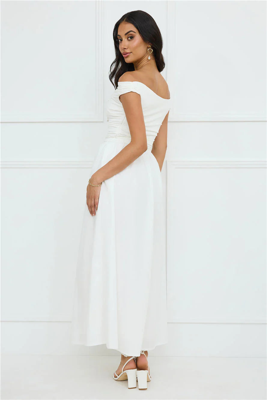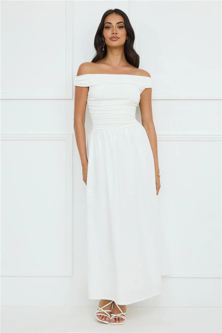 Embrace effortless elegance in the Camellia Charm Off Shoulder Maxi Dress. Featuring a stretch off-the-shoulder top and a gorgeous flowy skirt. Style with heels.