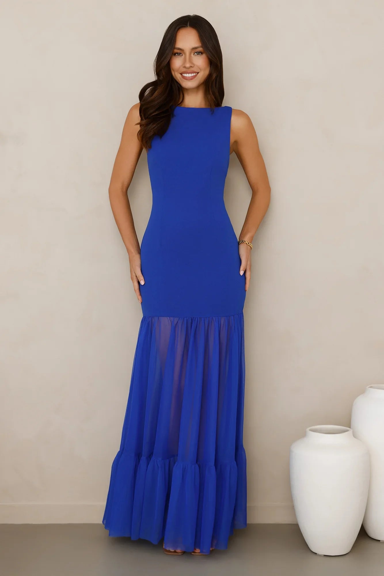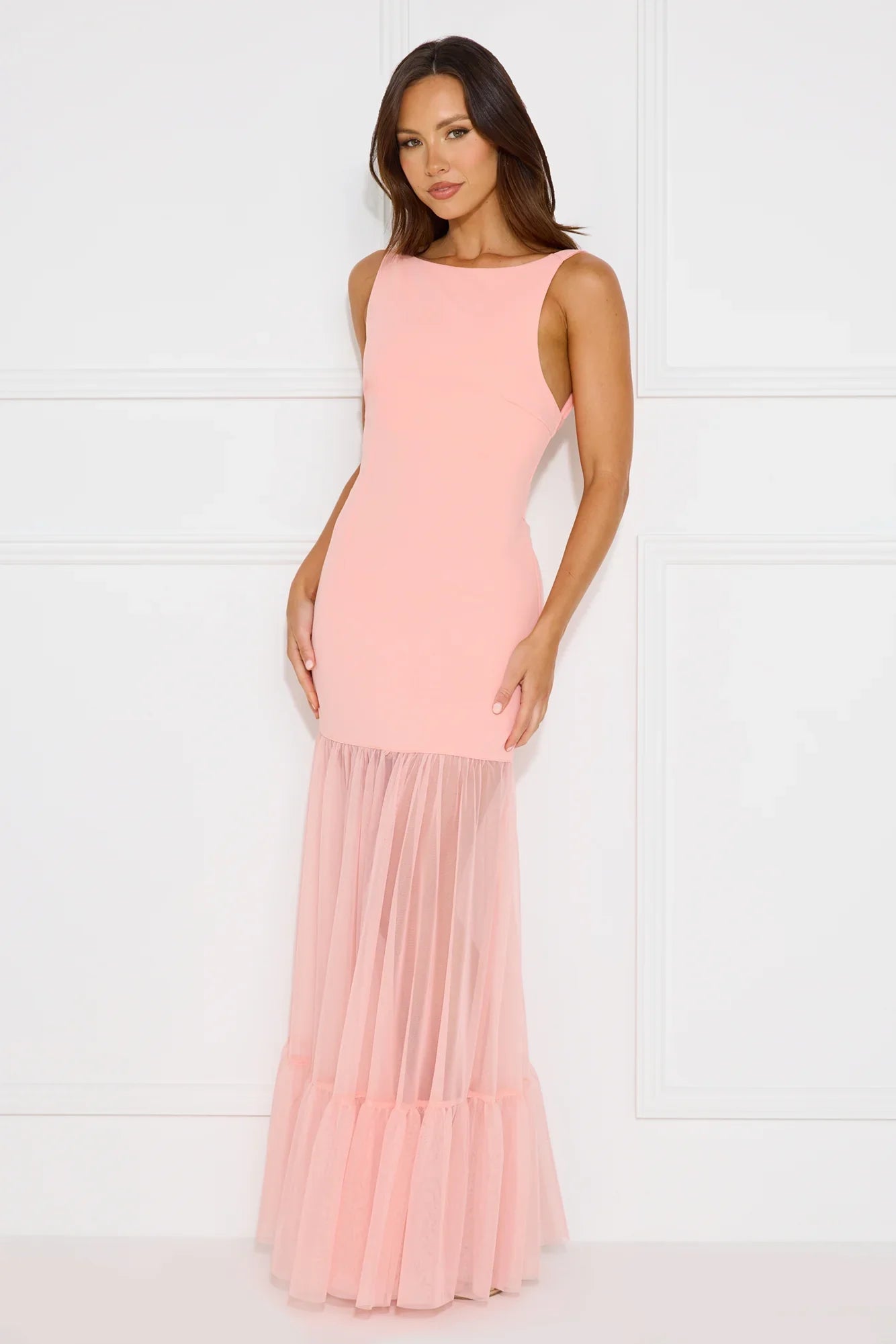 Dress to impress in the Chic Whispers Maxi Dress. Featuring a gorgeous sheer mesh skirt and a tie-up back that'll have the spotlight on you! Style with heels and curls for a 'fit that'll crown you best-dressed!