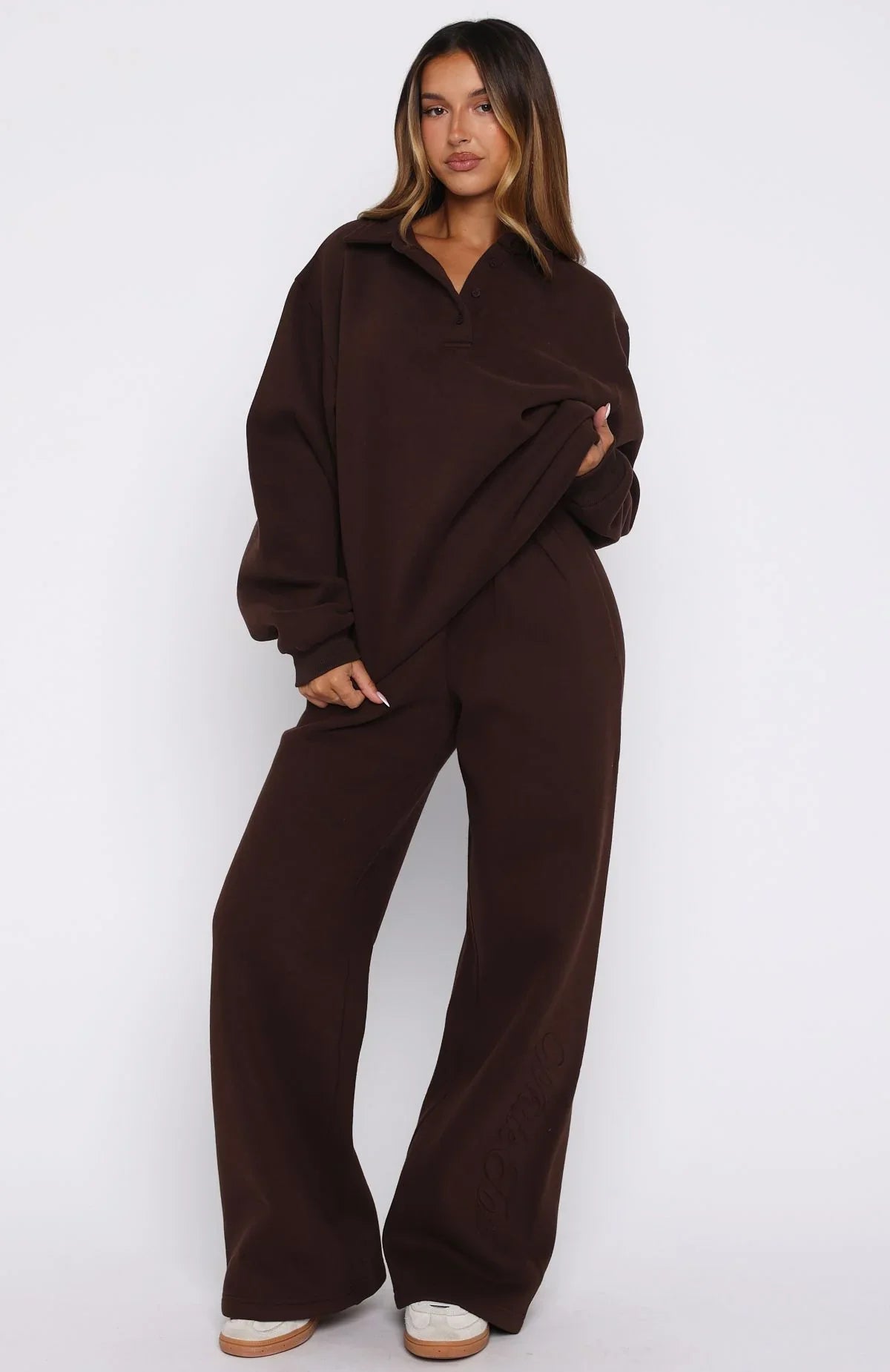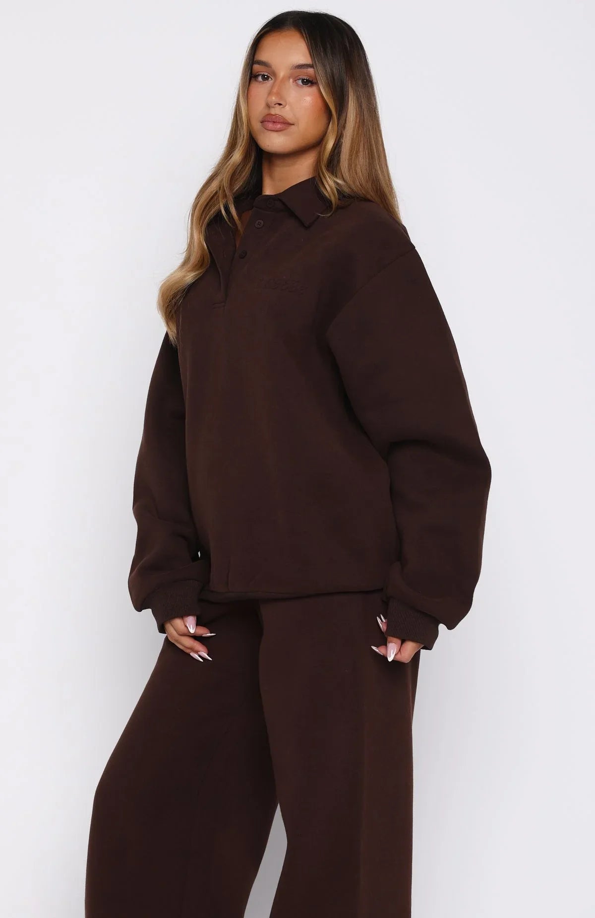 Slip into pure chill in our Chill Moves Oversized Henley Sweater in Chocolate! Features a soft fleece interior, oversized silhouette with a collared V‑neckline, button placket, drop shoulders, long sleeves, ribbed cuffs and hem, and a subtle White Fox emboss accent. Style with the matching Chill Moves Wide Leg Sweatpants Chocolate for a cosy fit.