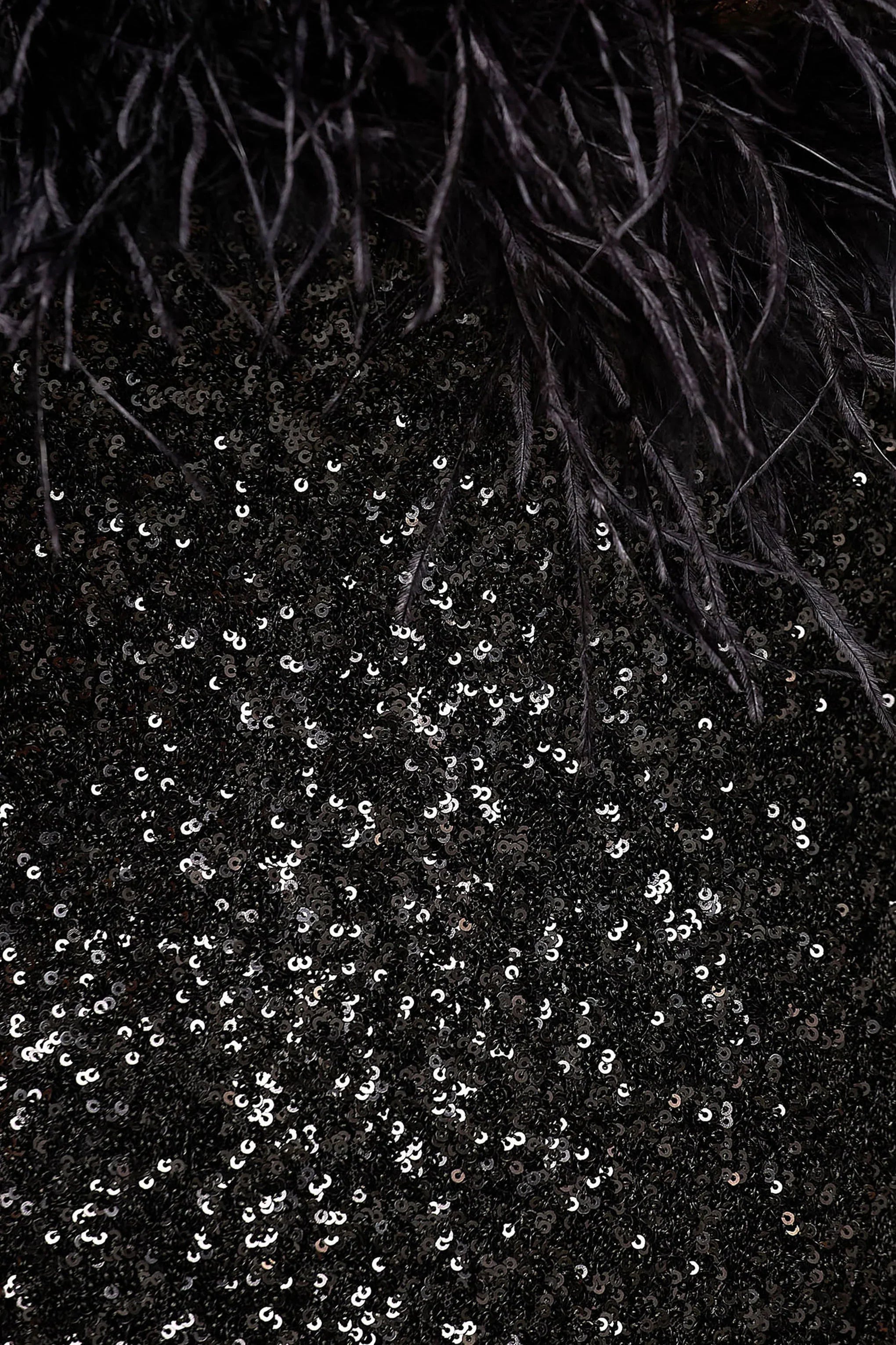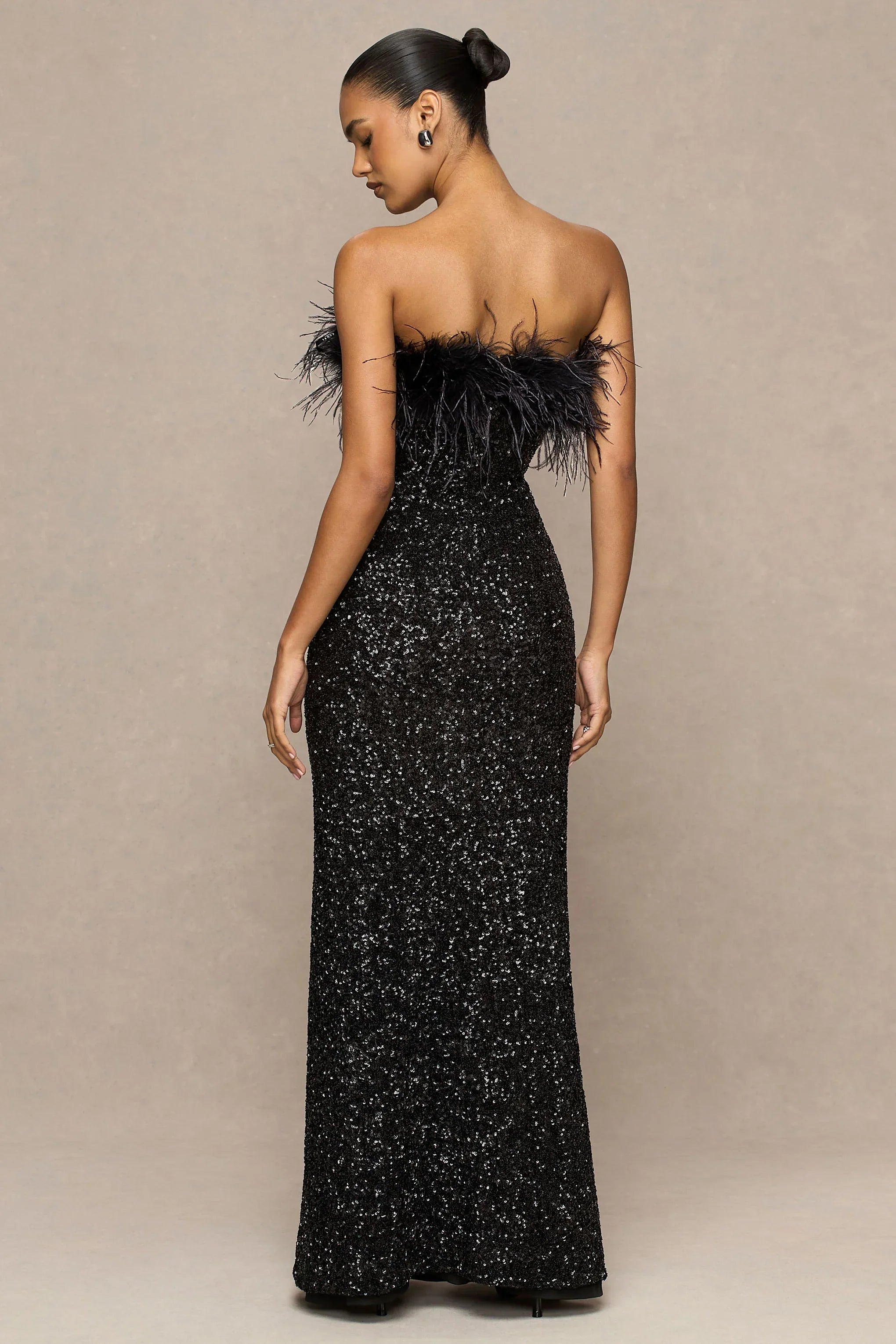 Introducing Daze, the ultimate showstopper for nights that demand drama. Crafted from our premium black sequins, this maxi dress sparkles with every move while sculpting a sleek, body-skimming silhouette. The bandeau neckline is finished with bold feather trim, bringing high-impact glamour to a timeless shape. Floor-sweeping in length, Daze is pure after-dark luxury.