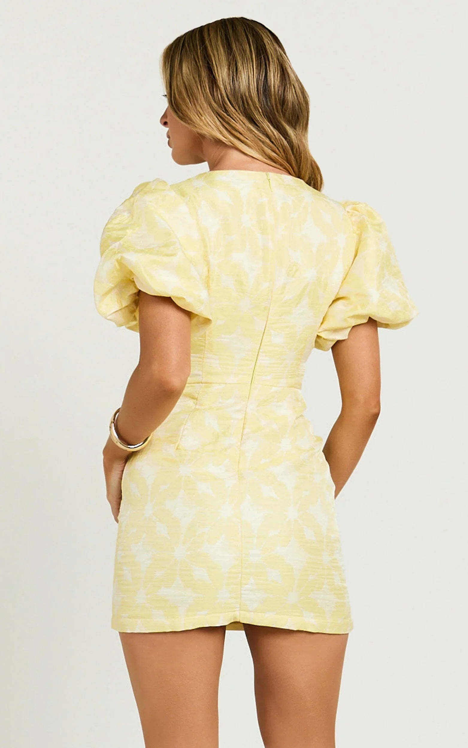 Description Transform your look with the Diana Mini Dress - your next wardrobe essential that's as bold as you are. This Jacquard Short Sleeve Cut Out Dress in a vibrant Lemon shade isn't just a dress; it's a statement. Designed for the daring and crafted for the confident, this dress is a celebration of you.