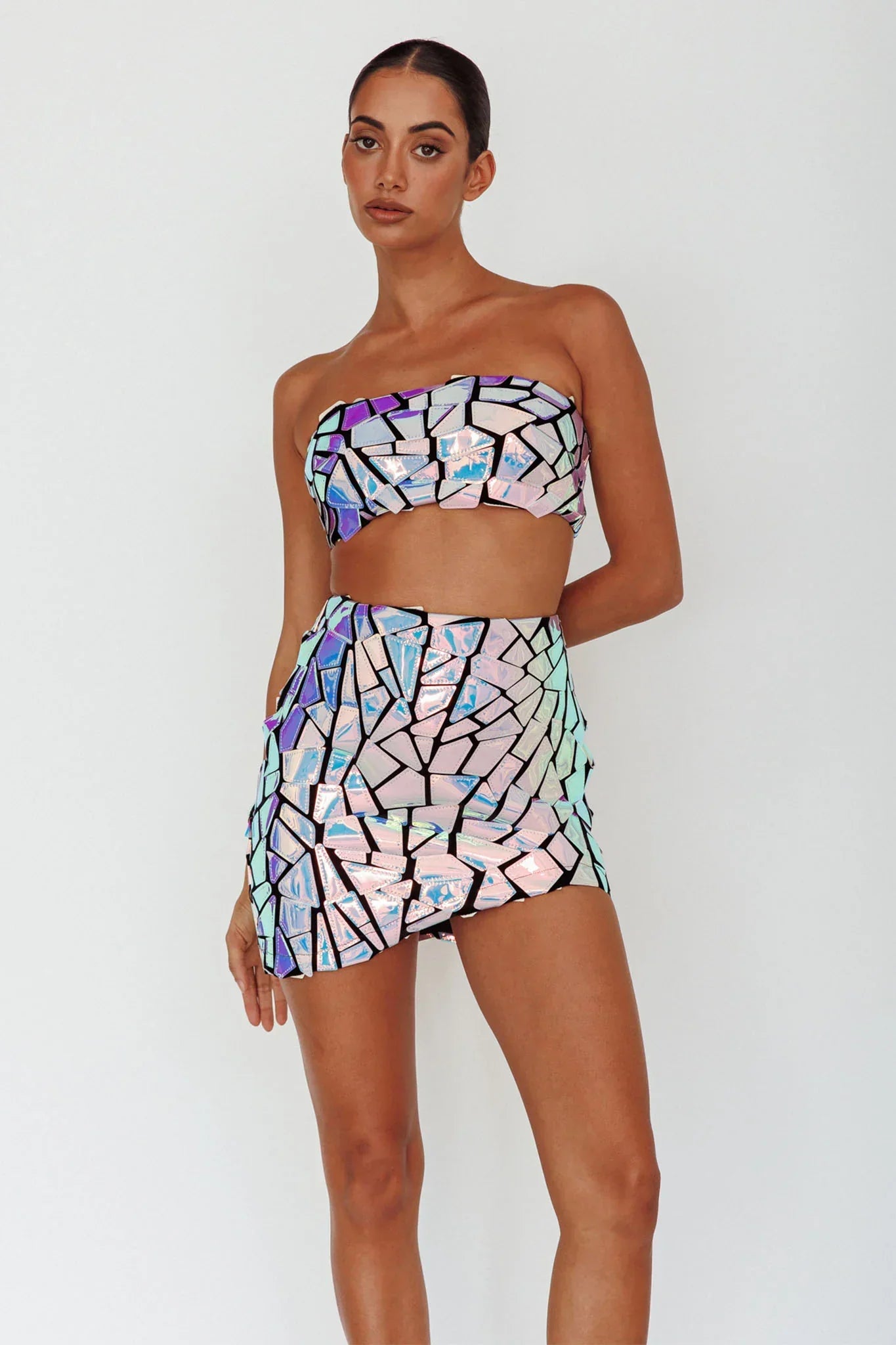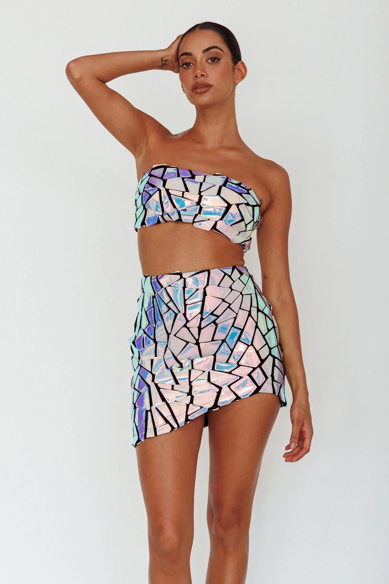 Light up the room in our super hot El Camino mini skirt. We are obsessed with its iridescent, mosaic embellishment! Perfect for a special occasion or birthday celebration. Team it with its matching top and black, platform heels for an unforgettable look.
