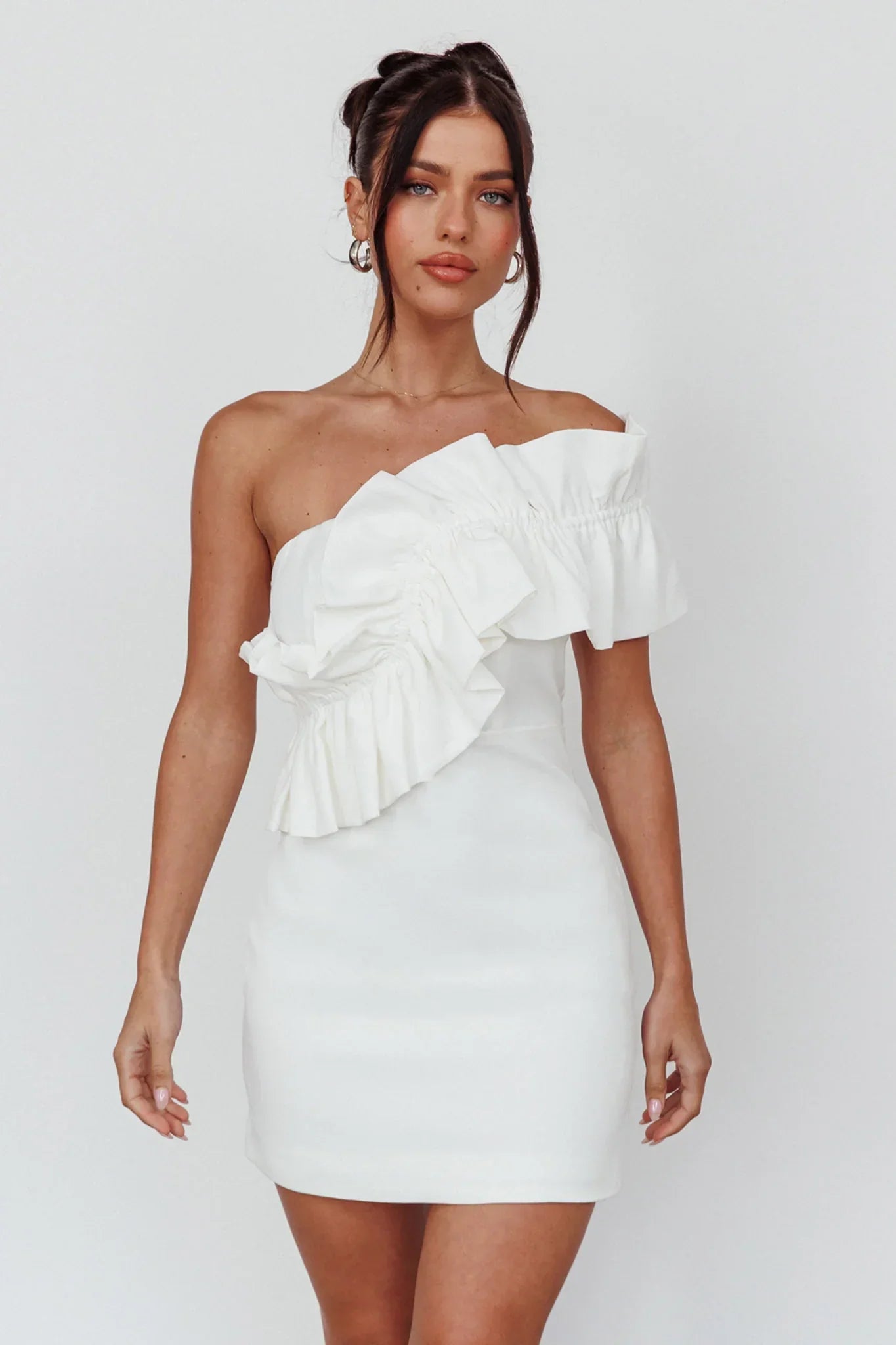 Turn heads in our super chic Grecca mini dress. We are obsessed with its one-shoulder frill feature! Perfect for a birthday soiree or a night out with your girls. Team it with strappy, white heels and a tote for an unforgettable look.
