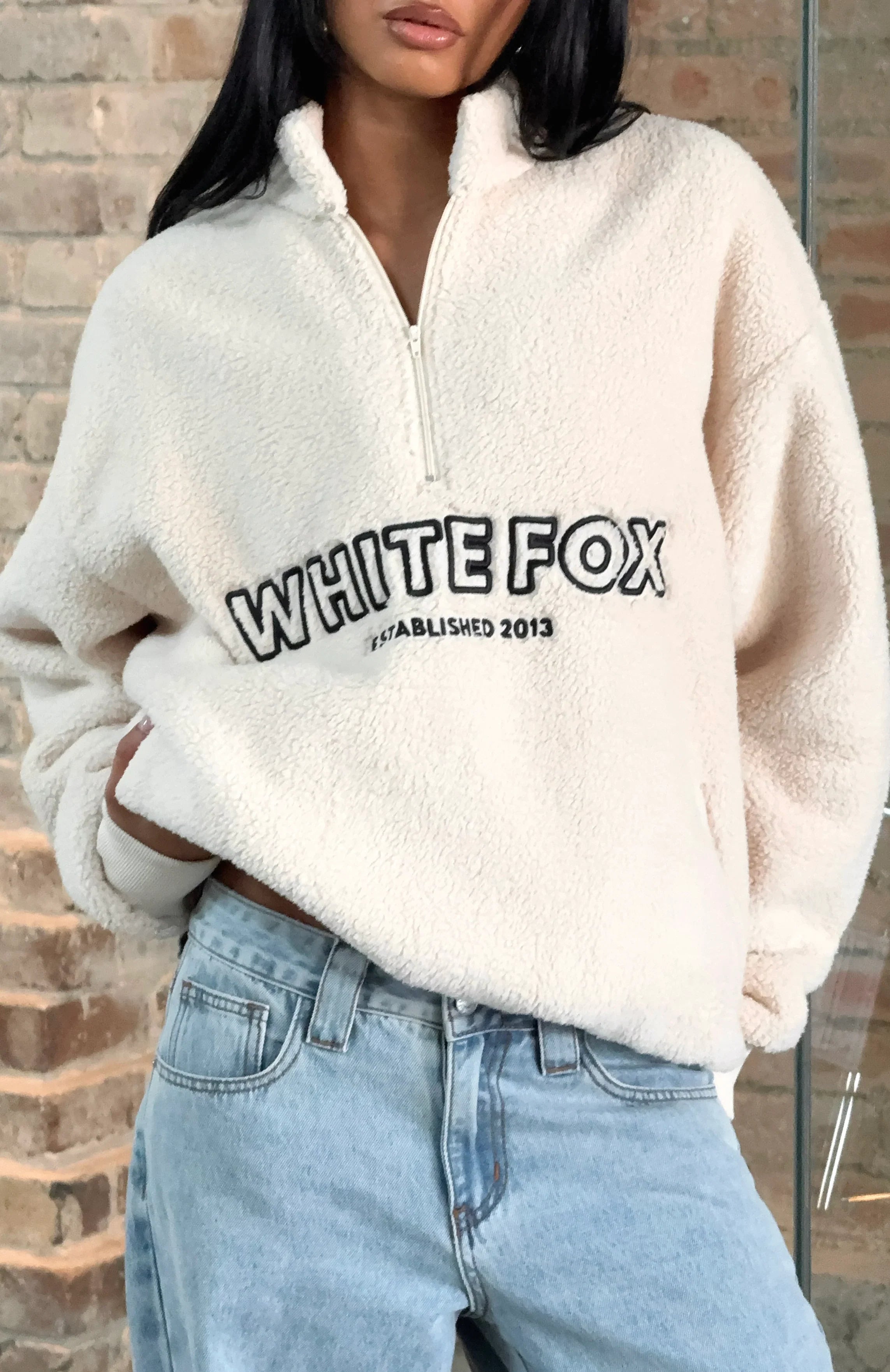 Embrace snuggle season in the Hard To Stay Focused Teddy Borg Zip Front Sweater in Cream. This cozy piece features a high collar, long sleeves with ribbed cuffs, and a quarter zip front. The firm ribbed hem band adds structure to the oversized fit, while the unlined teddy fabrication ensures warmth without bulk. An embroidered White Fox logo at the center front adds a subtle touch of street style. Pair with your go-to denim jeans and sunnies for the perfect chill weekend fit.