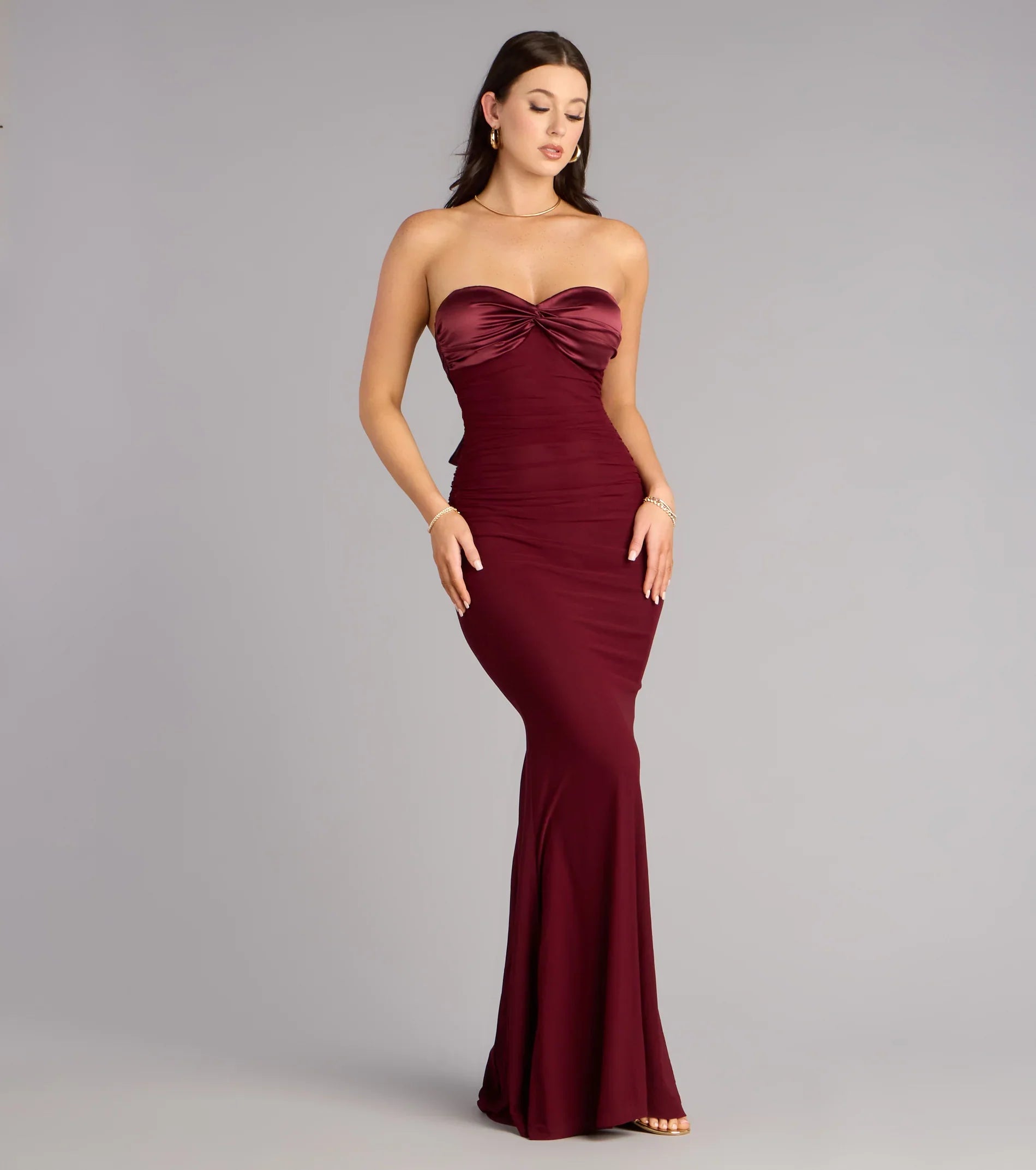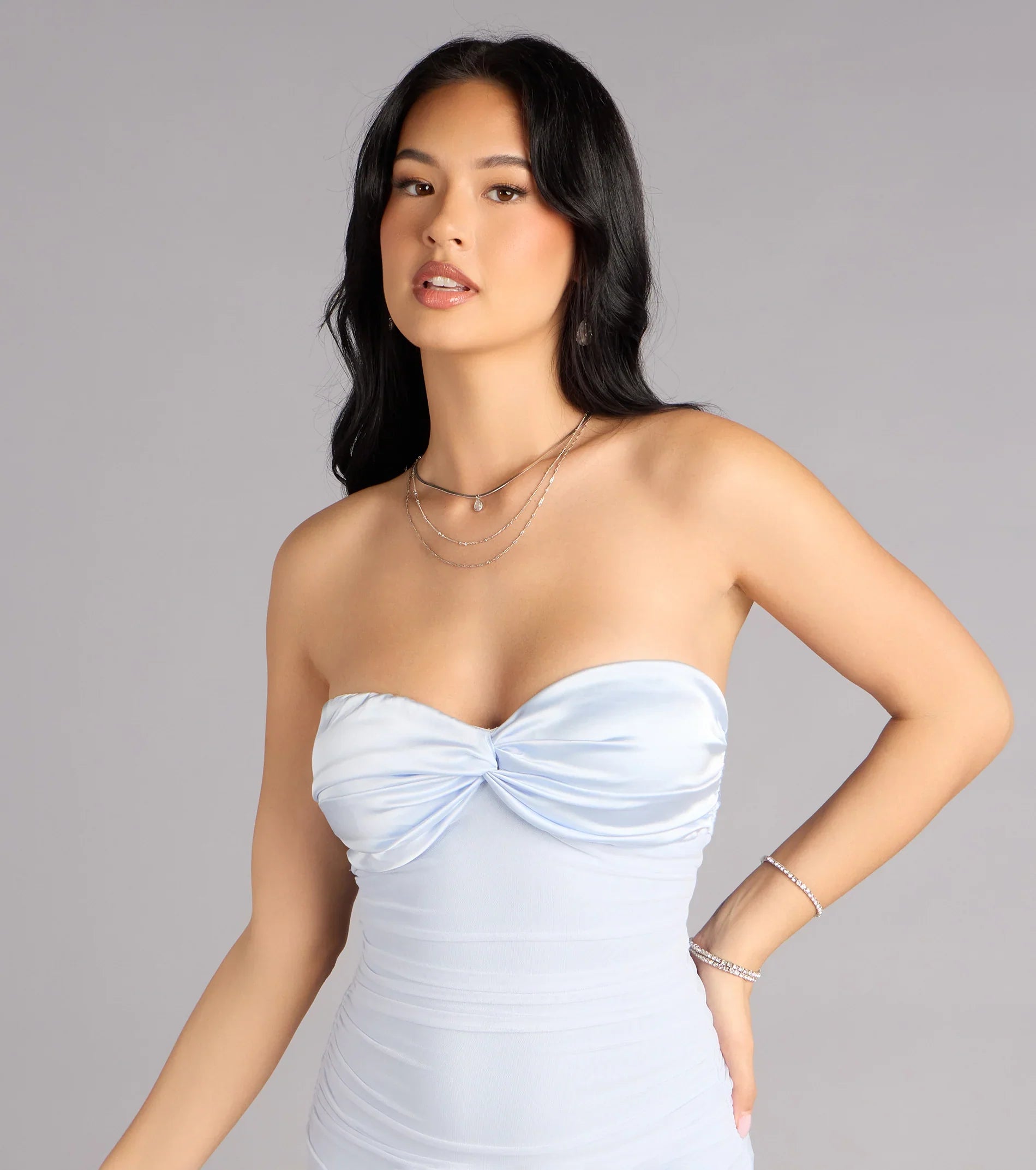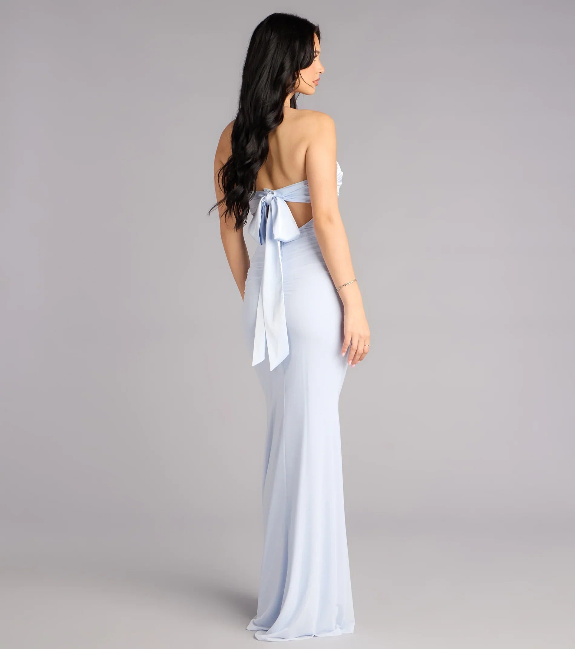 Designed for chic entrances and camera-ready moments, the Iris tie-back mermaid dress pairs a sculpted mesh silhouette with a softly twisted satin sweetheart detail. It’s the kind of look that moves with confidence, leaving an impression that feels effortlessly unforgettable.