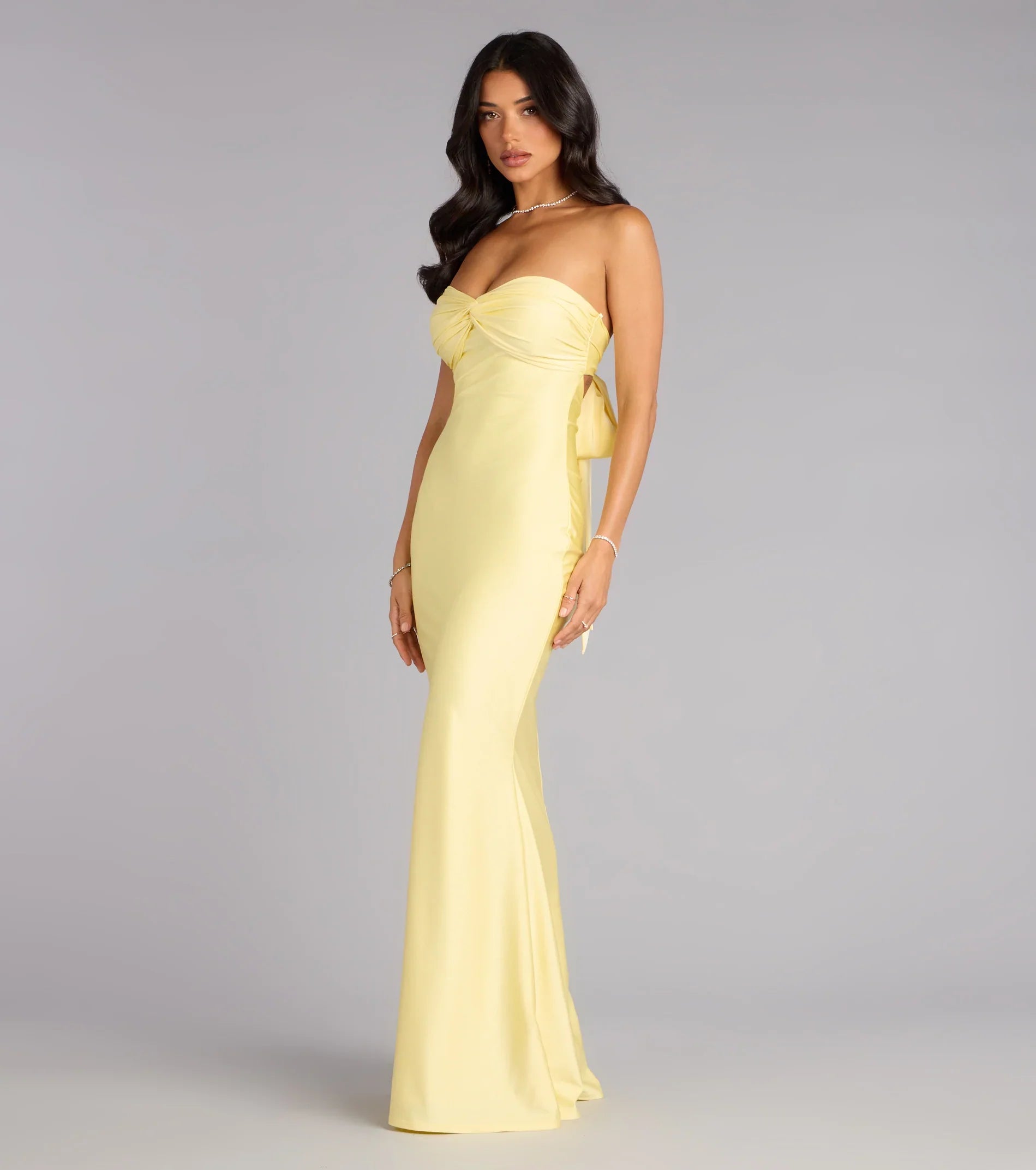 Sleek, chic, and oh-so-flattering, the Kimberly strapless formal dress boasts a trendy tie-back design and mermaid silhouette that accentuates your gorgeous curves!