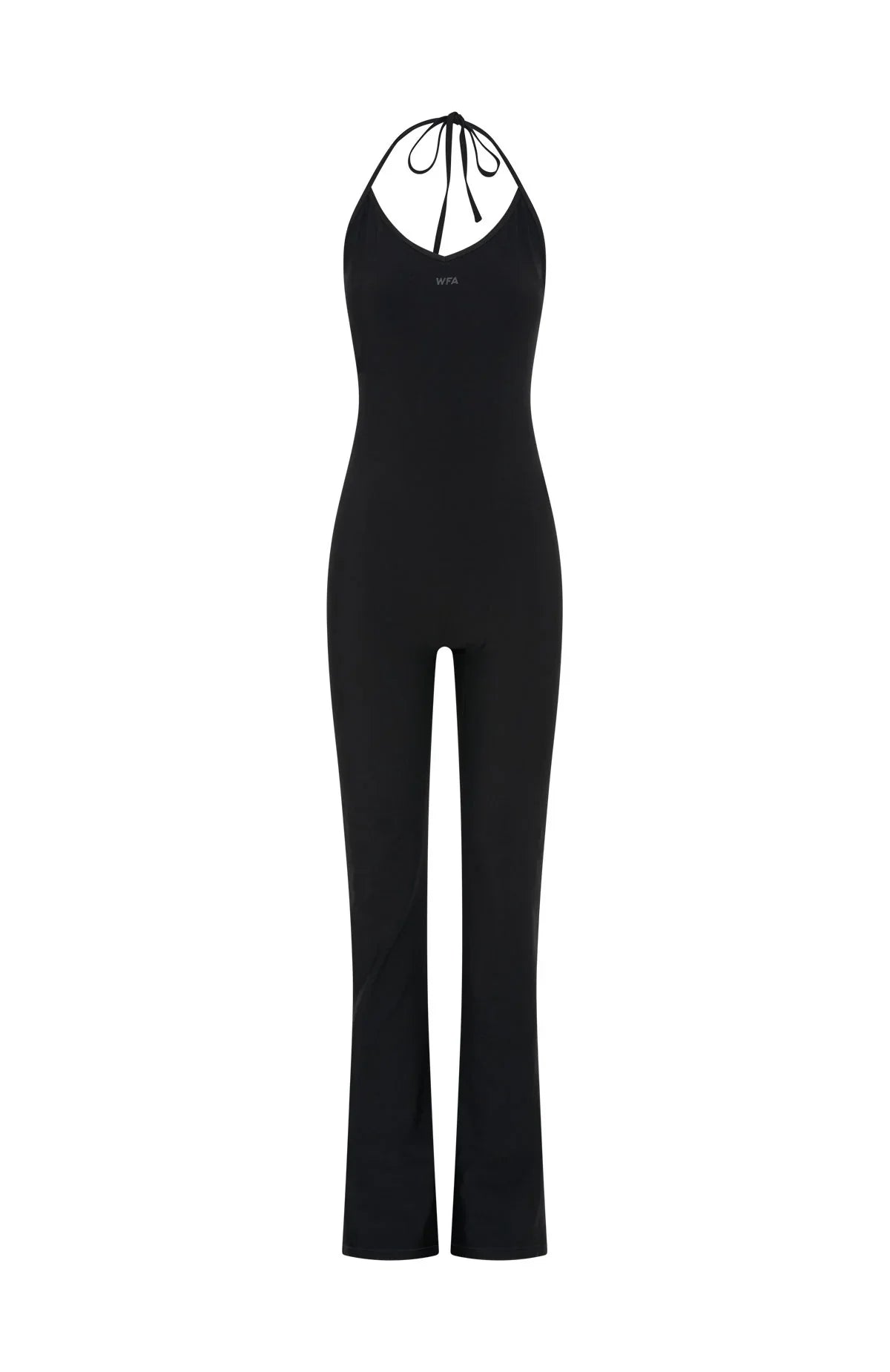 Elevate your active wardrobe with the Kinetic Flare Jumpsuit Black! Features thin self-tie halter straps, a flattering scoop neckline with WFA initials, and a built-in sports bra for support. The flared leg design and unlined, high-stretch fabrication ensures comfort. A fixed back strap enhances the backless silhouette. Pair it with Pilates grip socks and the Always Moving Quilted Tote Bag in Ballet Pink for a coordinated look that transitions effortlessly from studio to street.