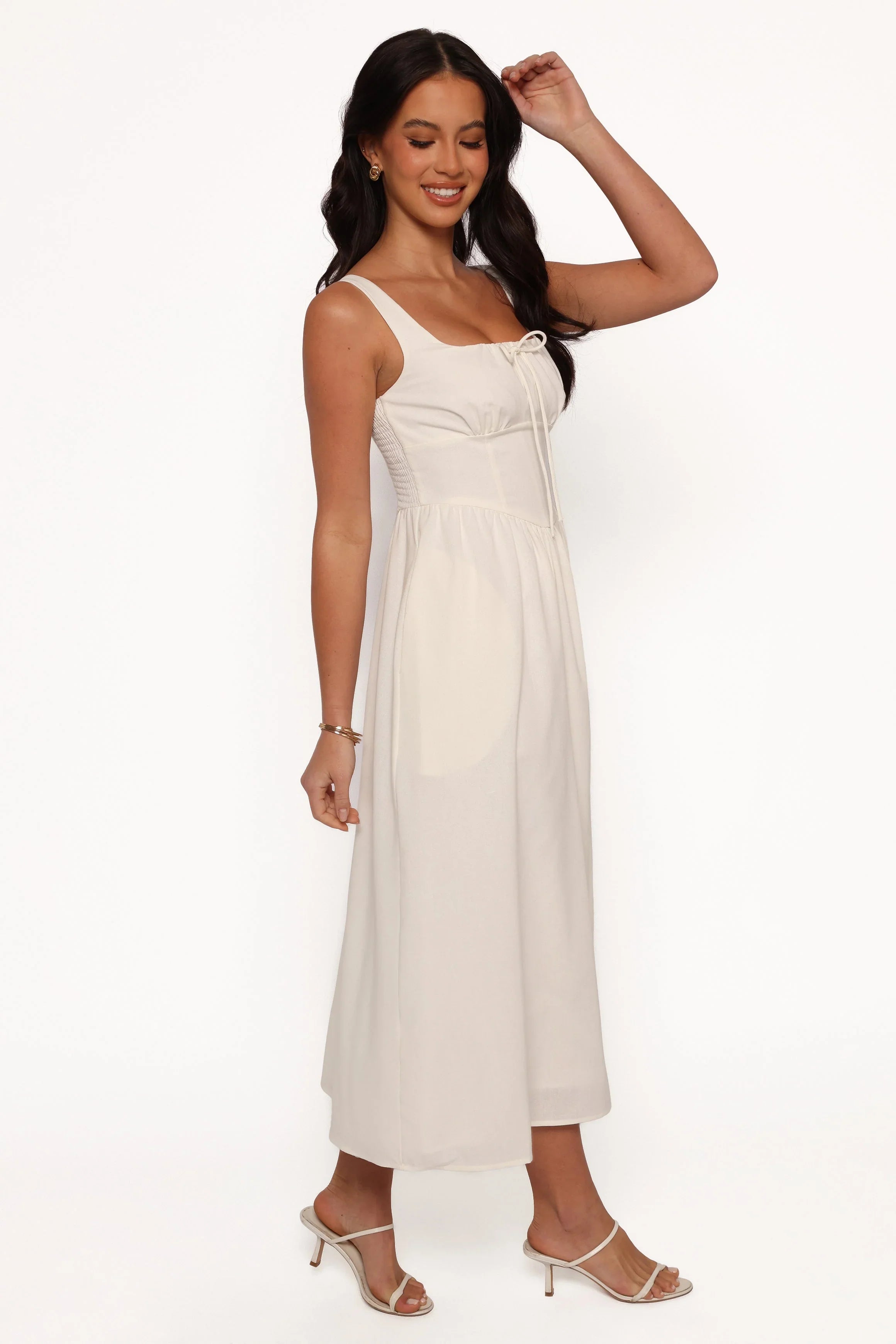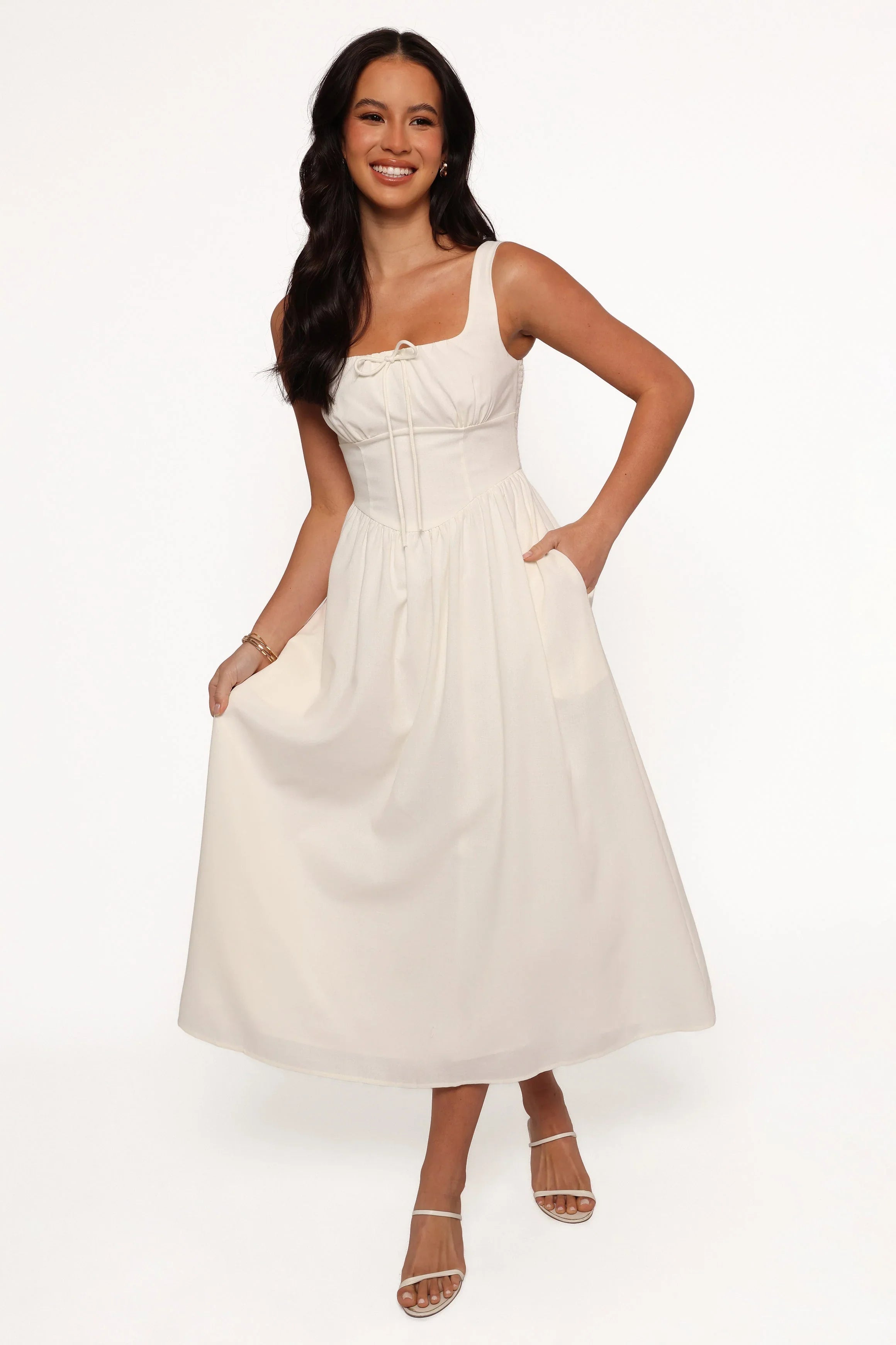 DETAILS This dress isn't just a piece of clothing; it's your passport to a season of romance, style, and endless charm. Our midi dress features a chic square neckline that frames your collarbone beautifully, exuding a subtle sophistication that's both timeless and trendy.