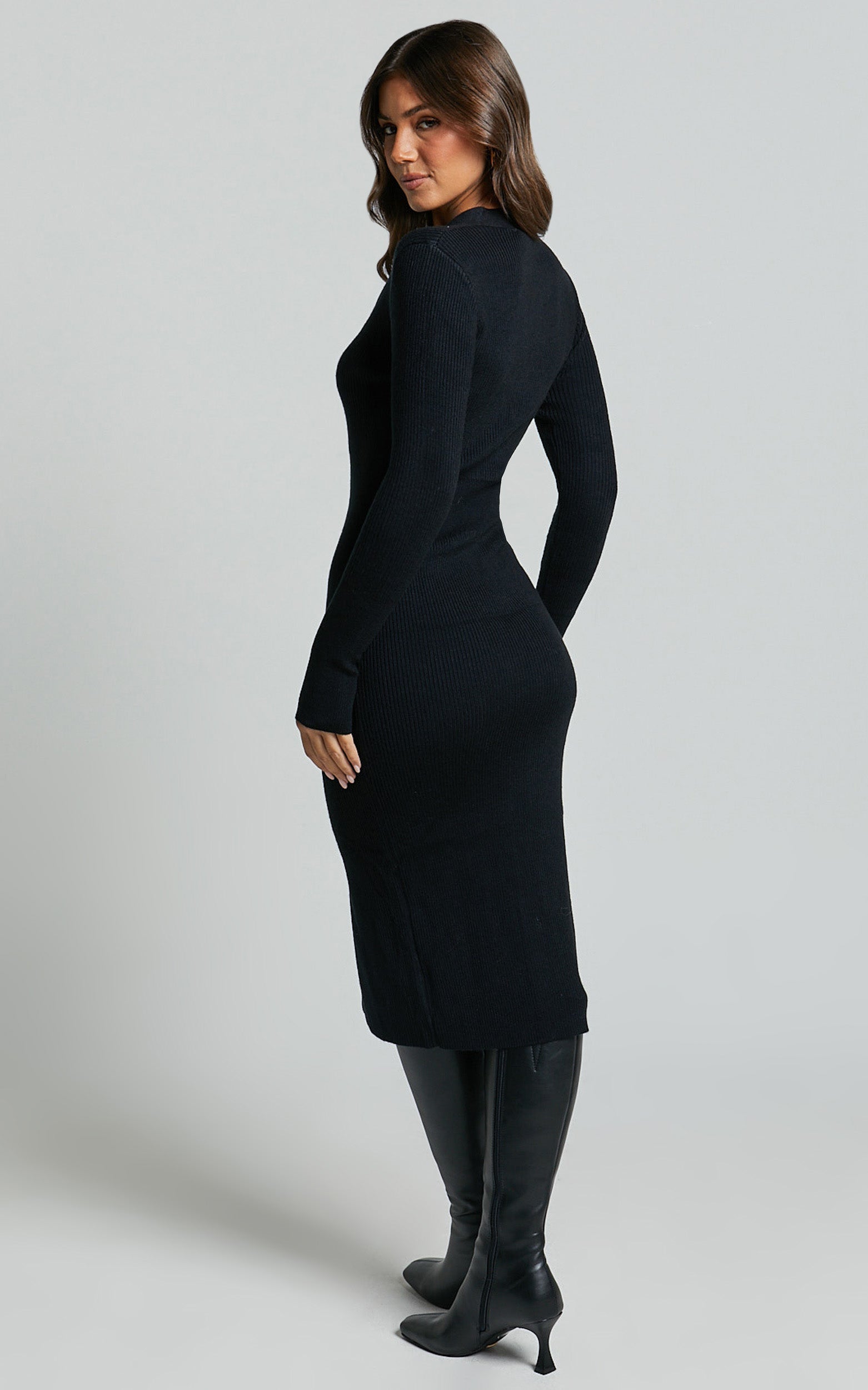 Make maximum impact with minimal effort in the Leahanna Dress! This comfy knit midi features a button up front, V-neckline, long fitted sleeves, slim bodycon fit and a ribbed finish. It's super easy and perfect for casual days or nights out. Wear it with heeled boots during the cooler months and heeled sandals during the warmer months!
