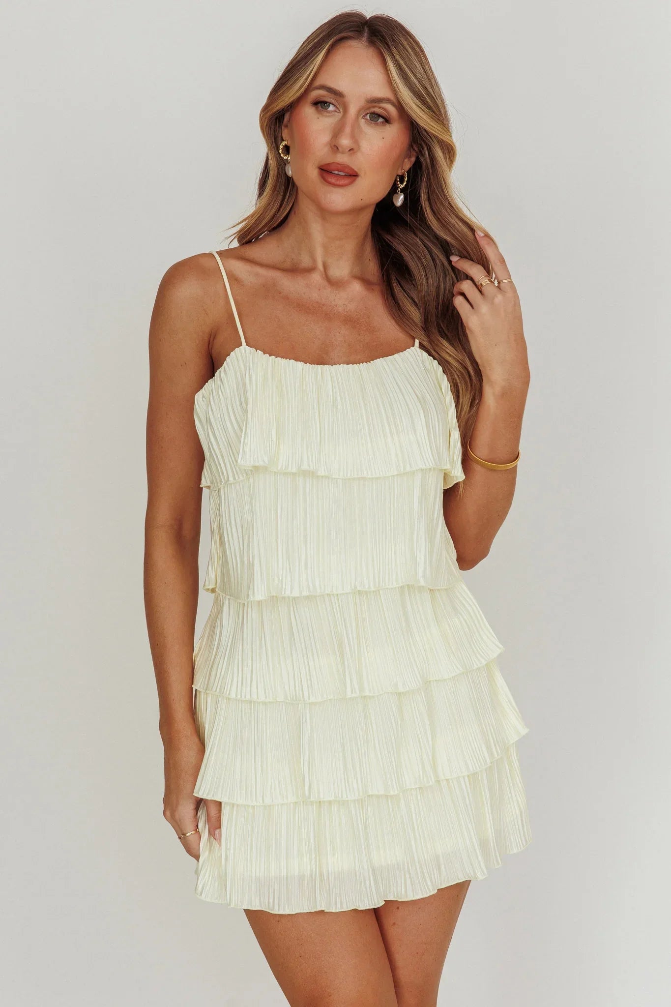 Designed for the stylish and feminine, our My Type mini dress is bound to leave an unforgettable impression. Featuring tiered ruffles design, crafted from a luxe plisse satin fabric, it's the perfect dress for parties or special events! Highlight your personal style by pairing this dress with your signature jewelry pieces.