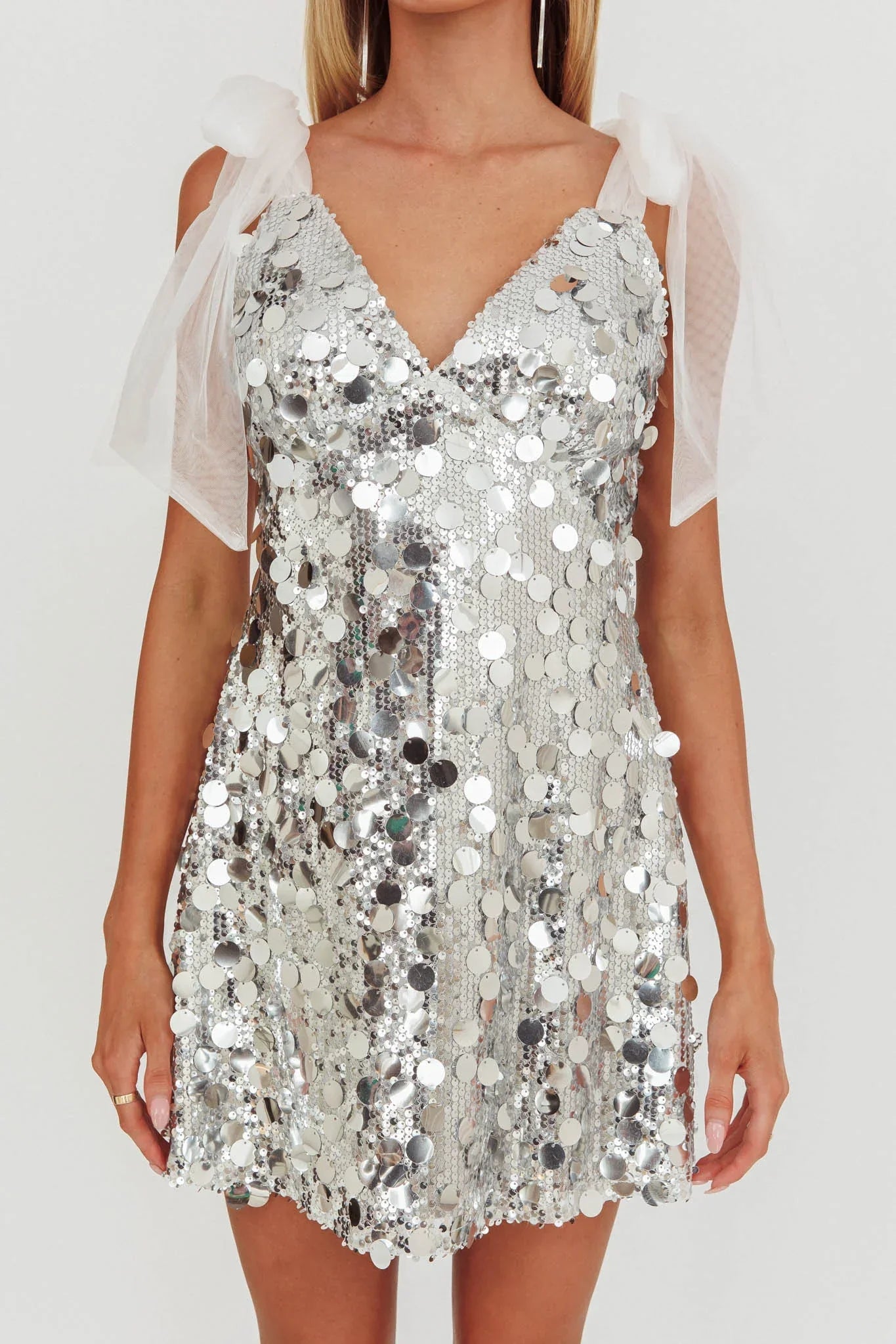 Stunningly beautiful, our Mykonos Morning mini dress is sure to make you the life of the party. Crafted from a playful sequin fabric and features tied shoulder straps- this dress is perfect for a night out with the girls! Complete your look with your favorite jewelry and heels.