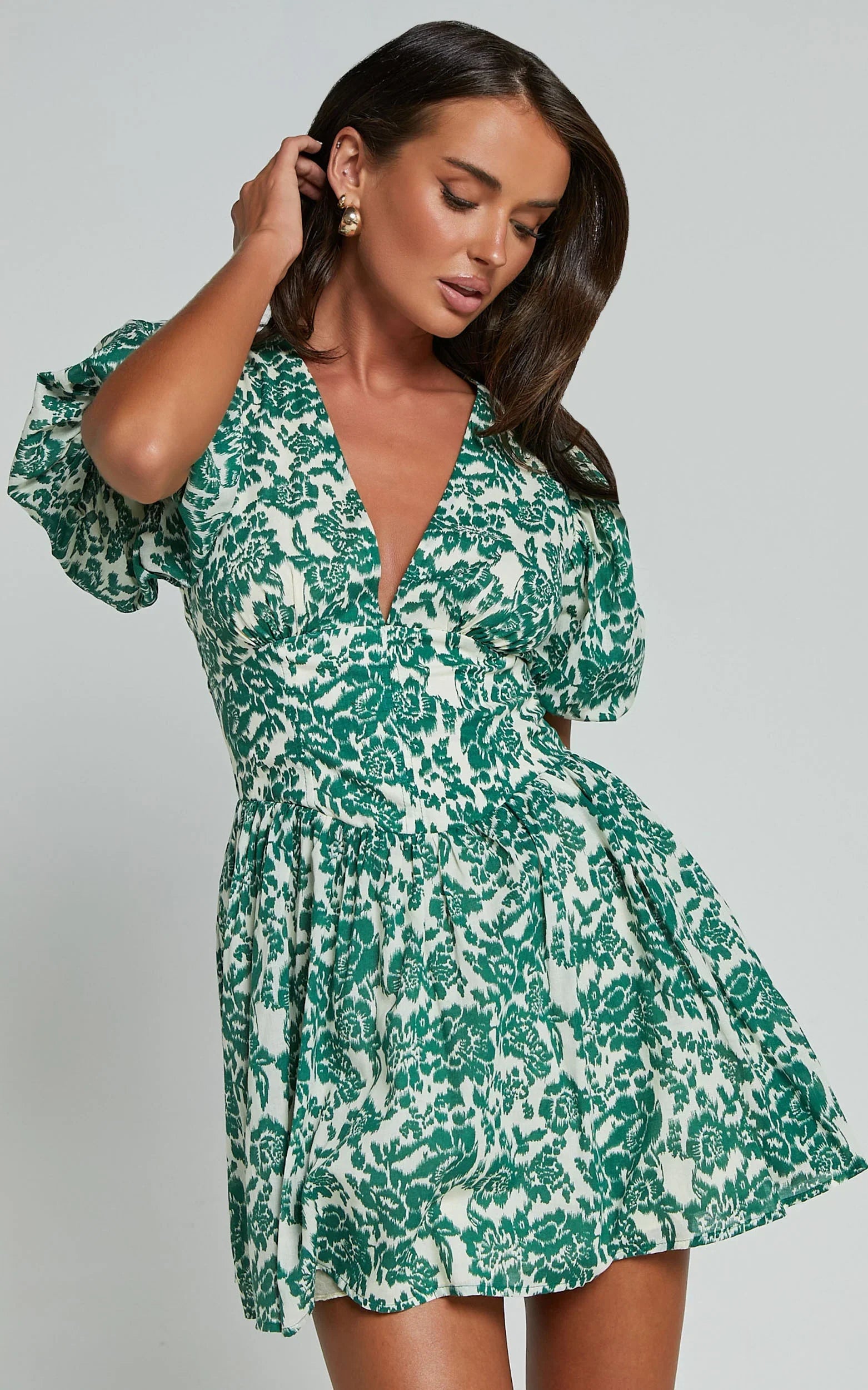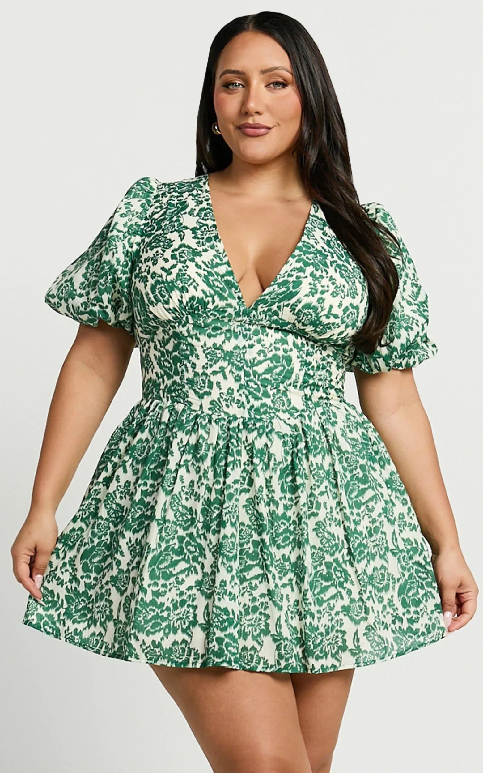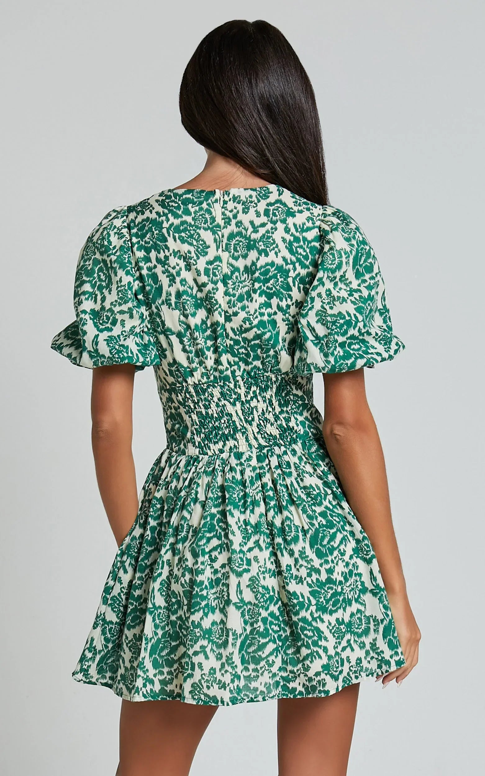 Stand out from the crowd in our Nelli Mini Dress - a vibrant green silhouette that is as unique and empowering as you are. This playful fit & flare dress features short puff sleeves and a flattering plunge neckline, perfect for any party day or night. Made with soft voile polyester fabric, this dress also offers a shirred back detail for added comfort and style. Get ready to turn heads and make a statement in this must-have mini dress!