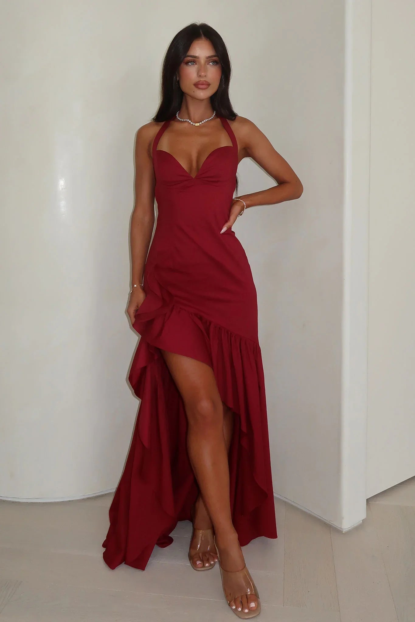 Get the Neva Maxi Dress for your prom night and make a statement. With a halter neck tie and sweetheart neckline, it's perfect for a night out. The low back, back tie, and frill skirt add a touch of elegance, while the leg split adds some sass. Don't worry about wardrobe malfunctions with the silicone tape on the inside of the neckline, invisible back zip and a hook and eye closure. Pair with black heels and gold jewellery for a stunning look!