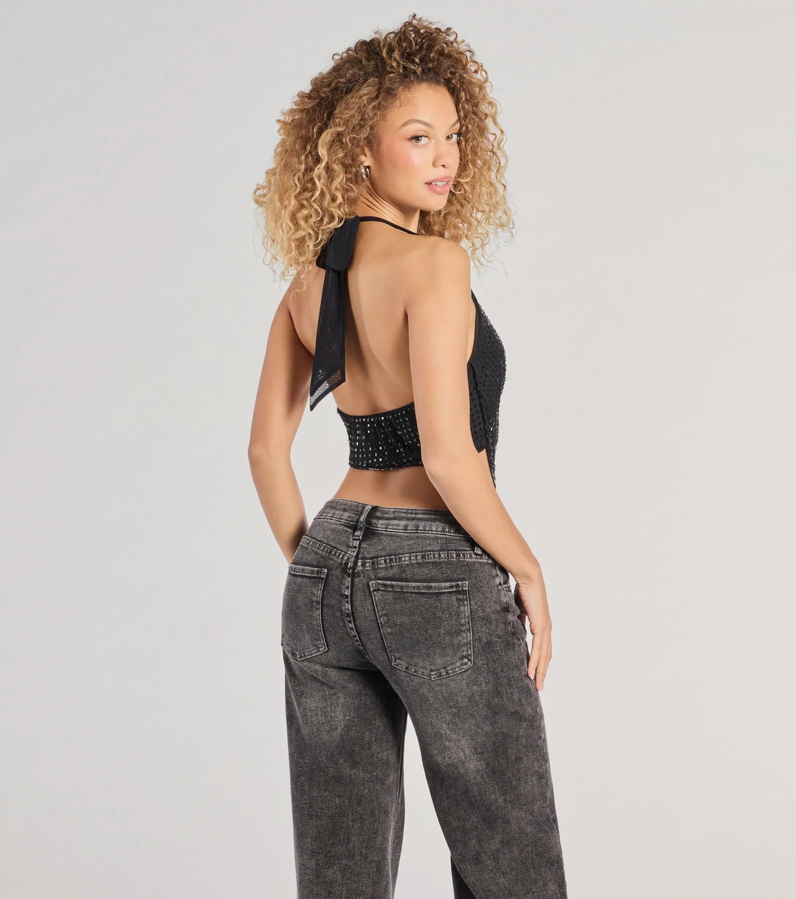 A cropped rhinestone halter top that'll inspire your next going-out look! It features a sultry plunge cowl neckline and a partially open back that turns heads. Pair with jeans.