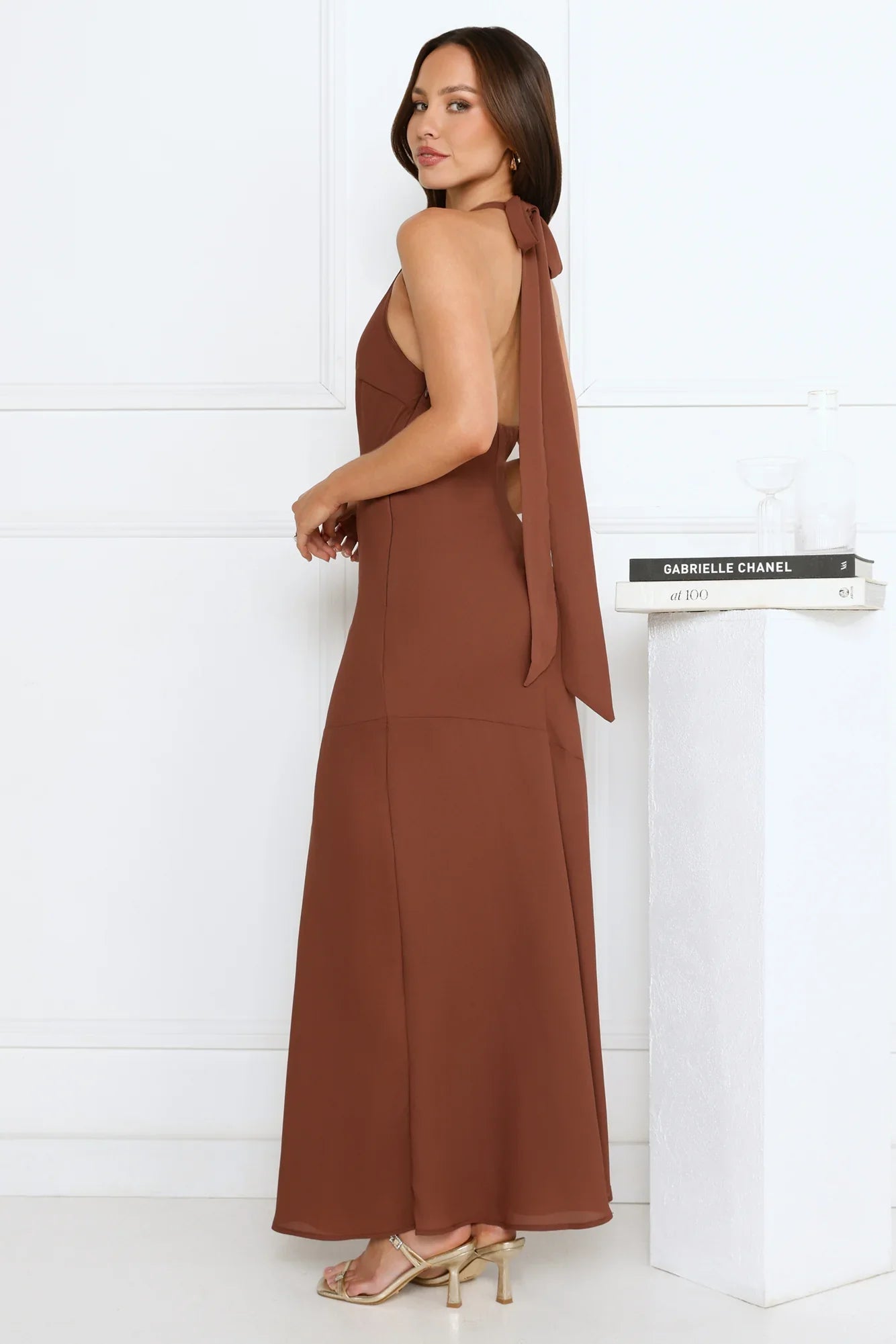 The Polished Edge Halter Maxi Dress combines sleek sophistication with a flattering V-neck and halterneck tie, flowing effortlessly into a soft, flowy skirt—perfect for an evening of effortless elegance styled with heels.