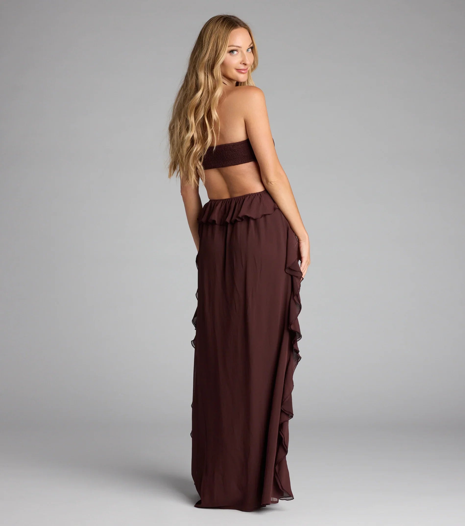 Love to make an entrance? Nail it with this chiffon maxi dress! With cascading ruffles, sultry cutouts, and a leggy slit, this chiffon maxi brings the drama every time.