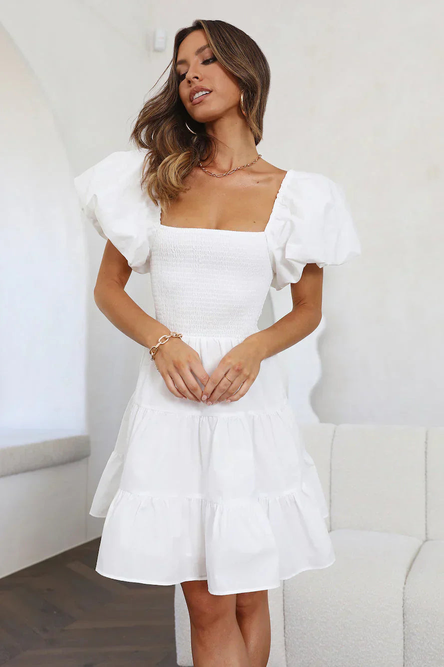 Look like a dream in the Salty Air Mini Dress. Featuring puff sleeves, an elastic bodice and a flowy skirt. Style with sandals for a cute look.?