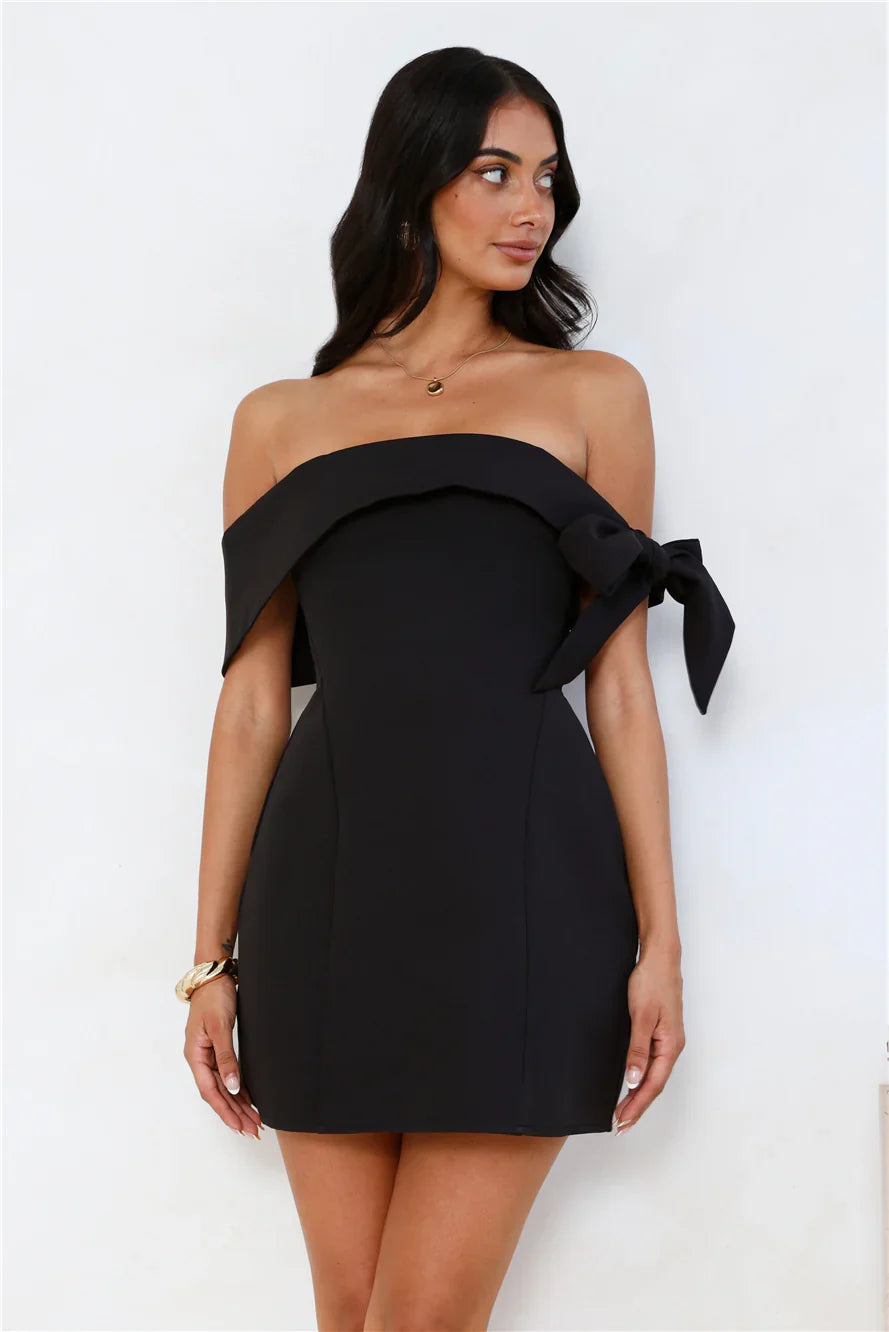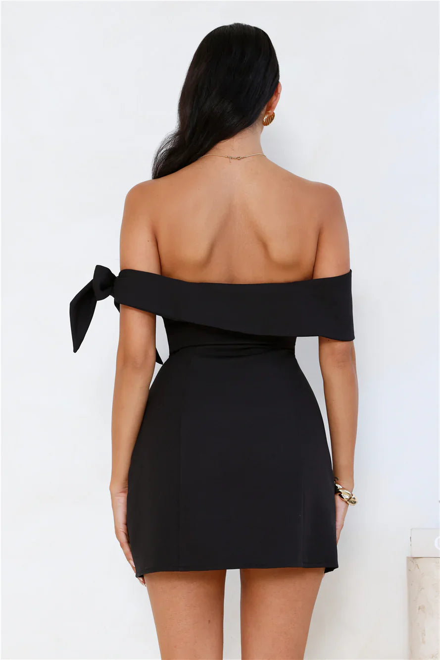 The Seashell Dream Off Shoulder Mini Dress is designed with an off-the-shoulder that ties up to one side. Perfect for a night out or a fun event styled with heels.