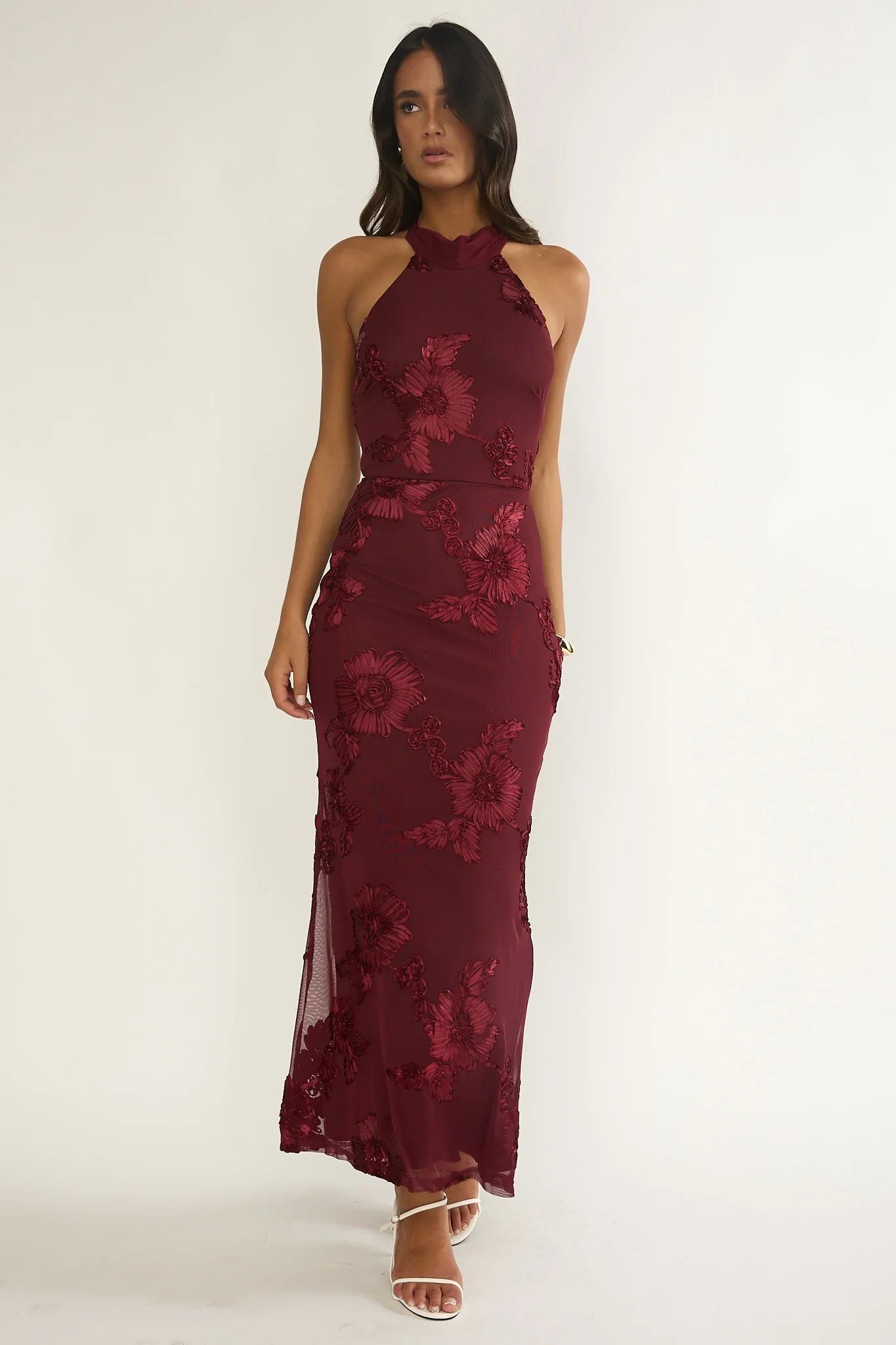 Make an entrance in our gorgeous Shana maxi dress. Featuring a halter neckline and a pretty floral embellishment. Perfect for a wedding or special occasion. Team it with strappy heels and a clutch for an unforgettable look.