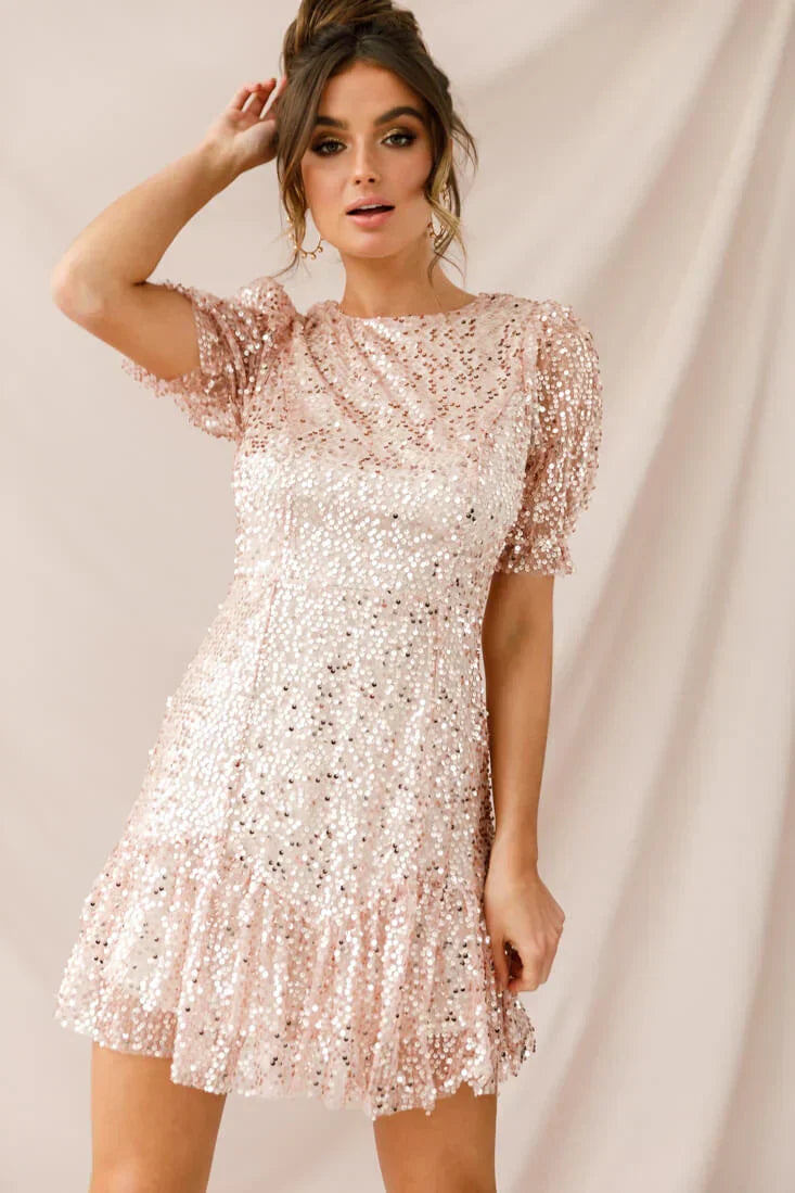 To quote our girl Rihanna, "you're a shooting star I see, a vision of ecstasy." And that's exactly what you will be in our Shine On mini dress! You'll be the brightest star in the room in this stunning, feminine dress featuring a ruffle hem and puff sleeves. Let's be honest though, this dress is ALL about that gorgeous sequin overlay! Shine bright like a diamond, baby!