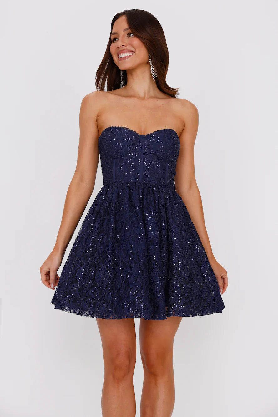 Glow all night in the Soirée Star Strapless Sequin Mini Dress, featuring delicate lace, a strapless silhouette, dazzling sequins, a flowy tulle underlayer and boning and padding support—pair it with metallic heels and accessories.