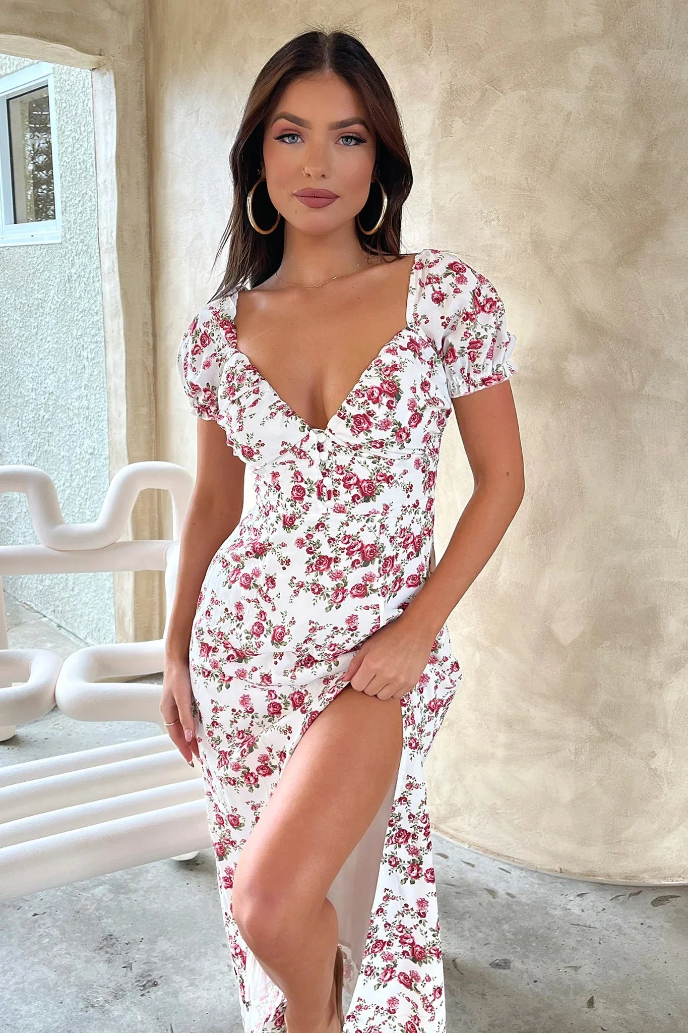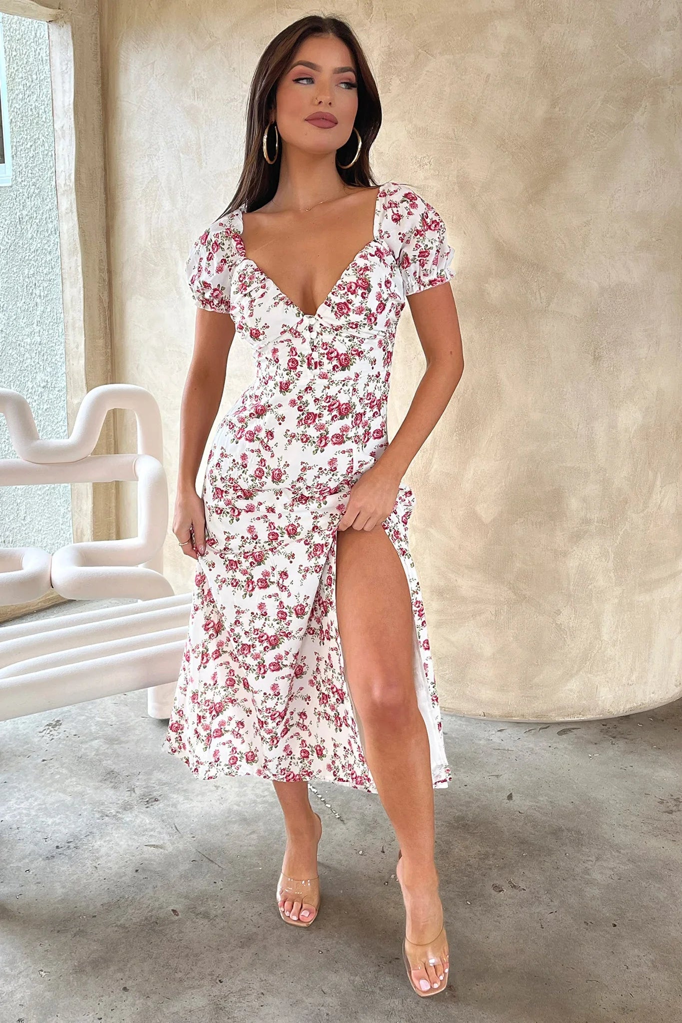 The prettiest dress for a cute Sunday brunch date! This beauty offers a sweetheart neckline, short puffy sleeves with frilled edges, buttons down the front, double lined bust, shirred material across the back, an invisible side zipper, a flowy fit and a cheeky side slit. Style her with Your go to flats, a little tote and some sunnies.