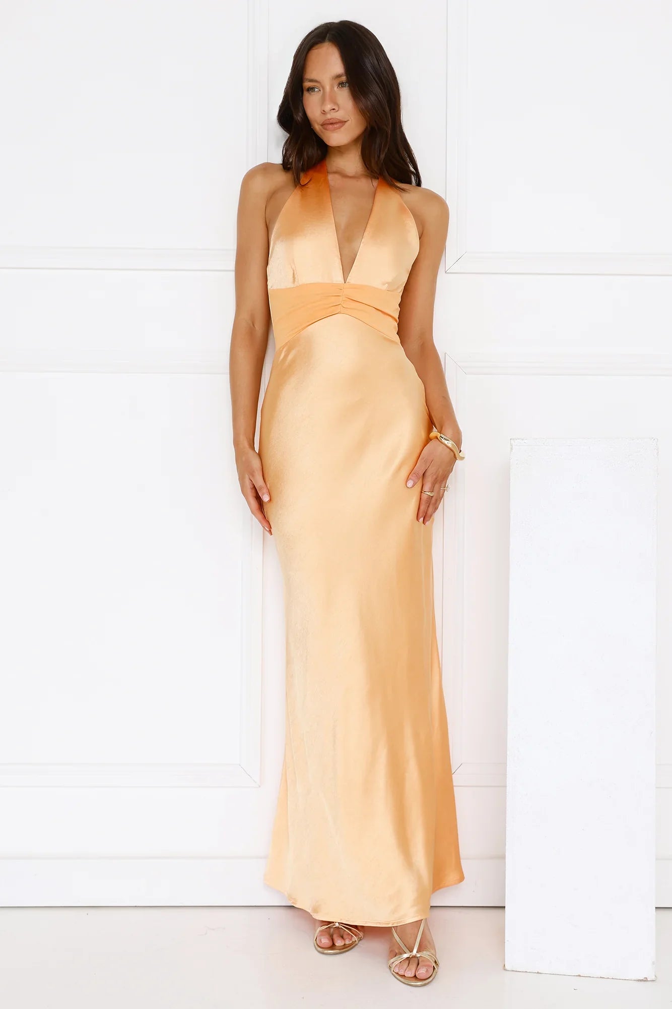 The Spiced Sunset Satin Halter Maxi Dress features a luxurious satin fabric, a halter tie, and a flattering V-neckline, with a stunning waist detail that elevates the look. Perfect for an evening out or a special event, pair it with statement heels and gold jewellery for an effortlessly chic vibe.