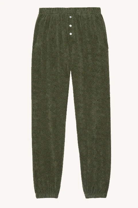terry henley sweatpant with mother of pearl button accent