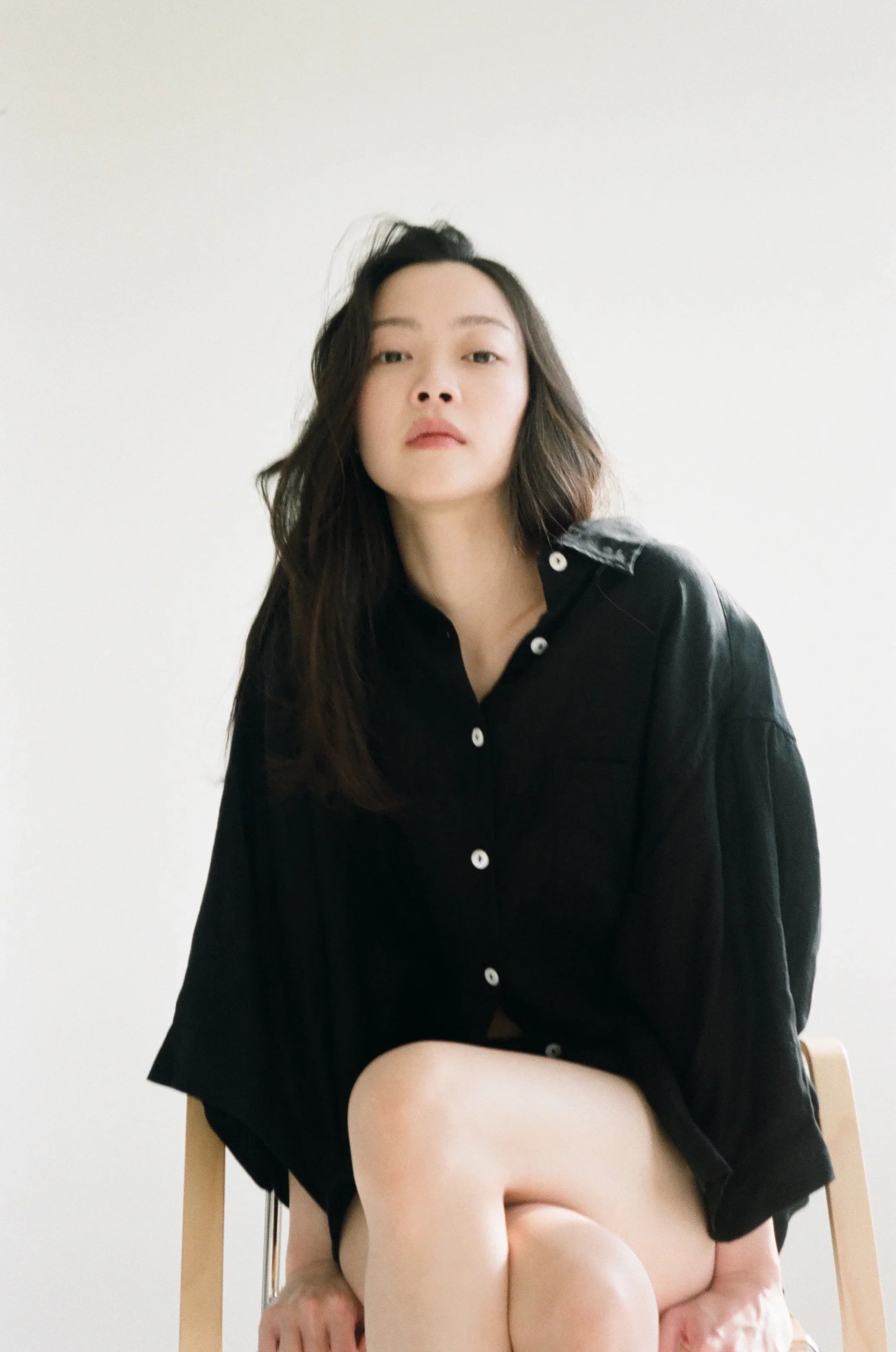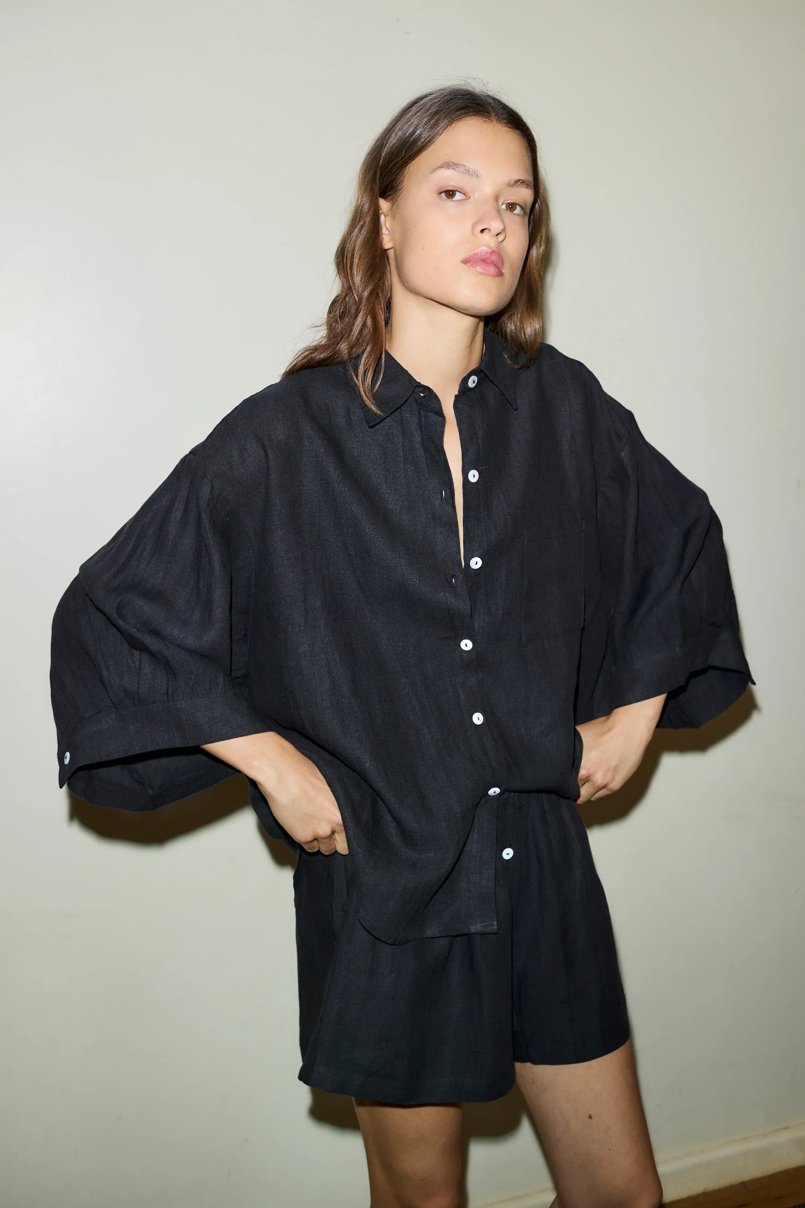 features an oversized box fit linen shirt with wide arms and a front pocket