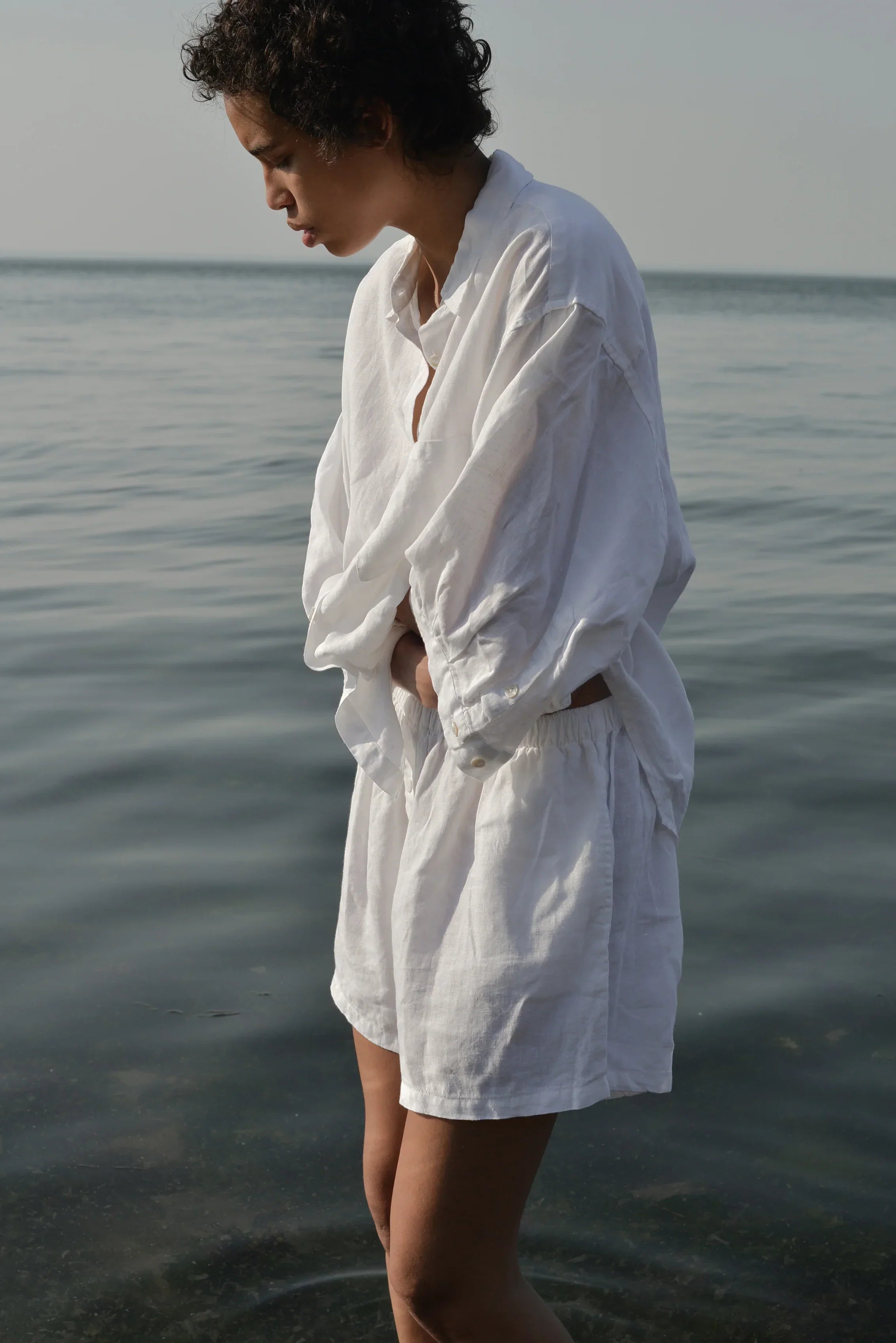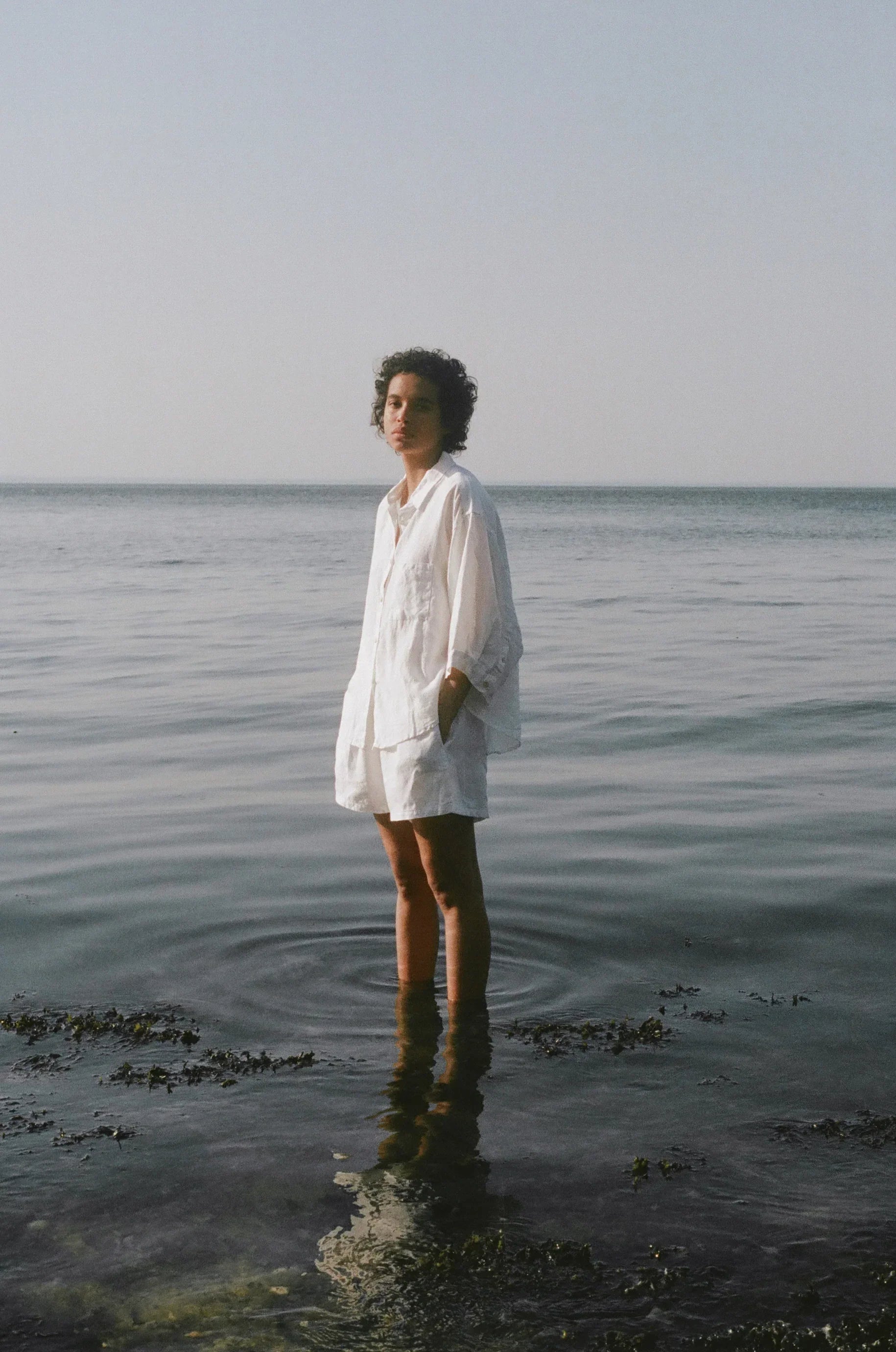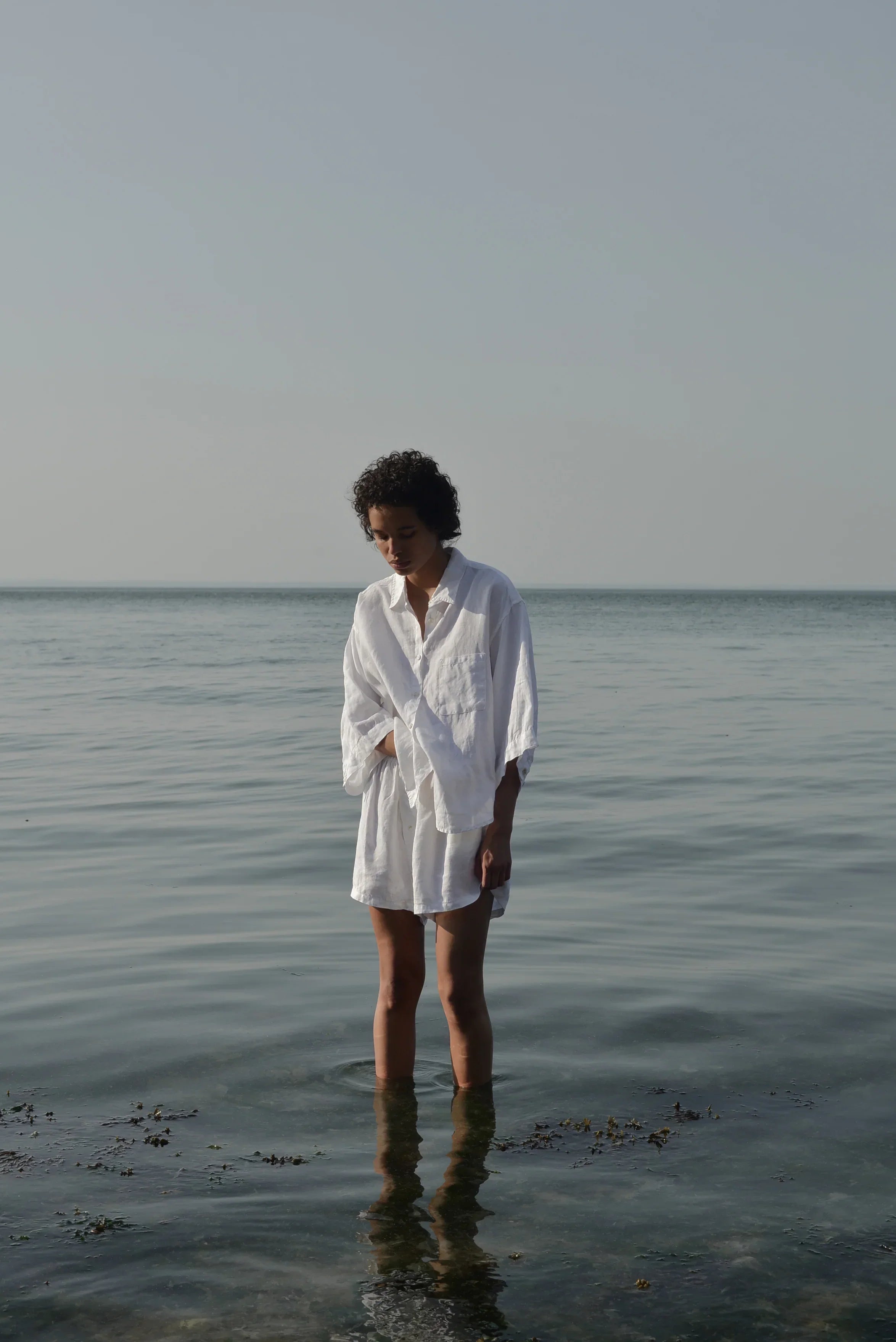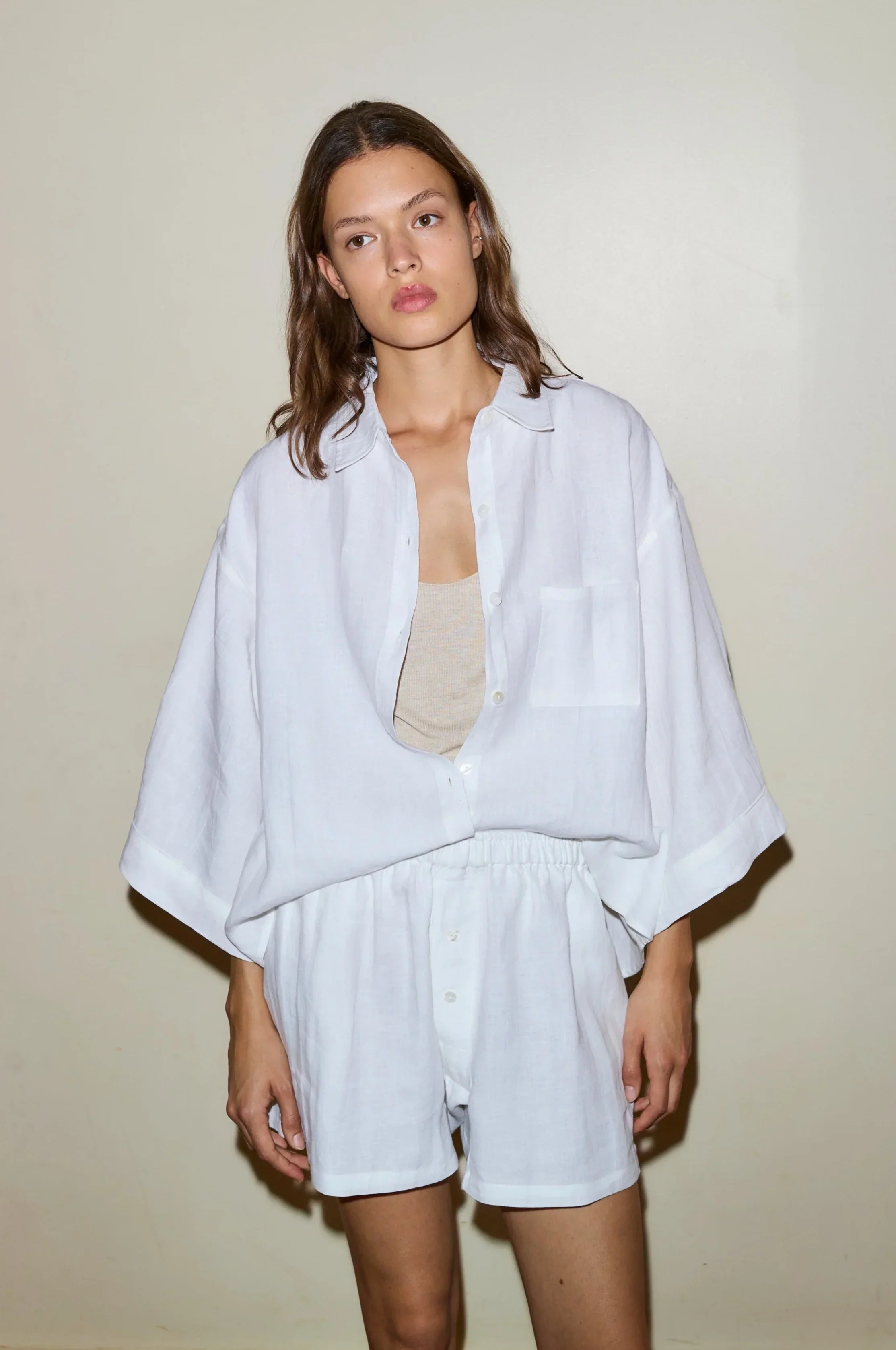 features an oversized box fit linen shirt with wide arms and a front pocket