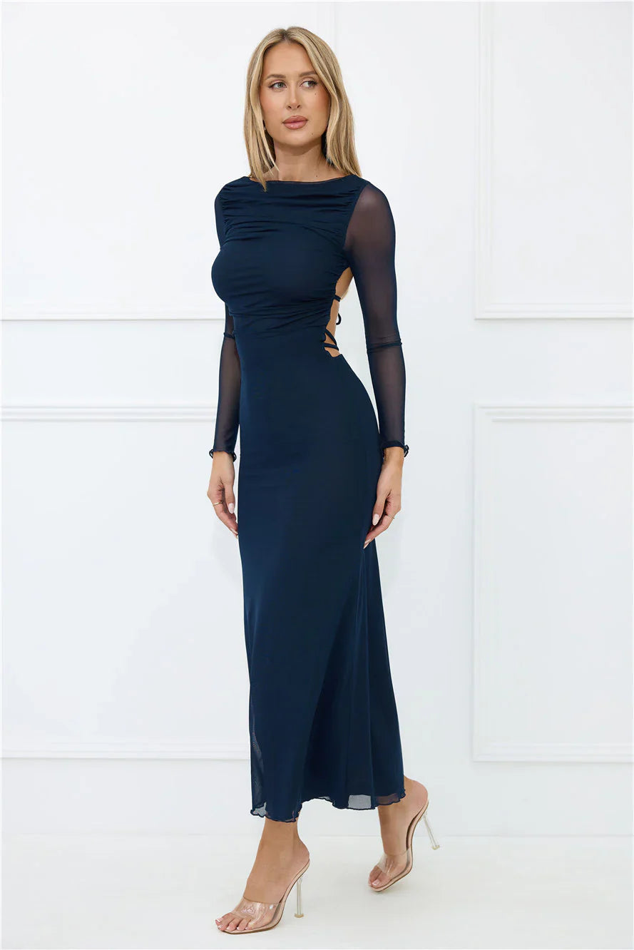 The Thinking Pretty Long Sleeve Maxi Dress is a stunning combination of stretch and mesh, with sheer long sleeves that add a delicate touch. The open back with a tie detail and silver ring accent creates a chic, alluring look. Pair with strappy heels and minimal accessories for an effortlessly sophisticated vibe.