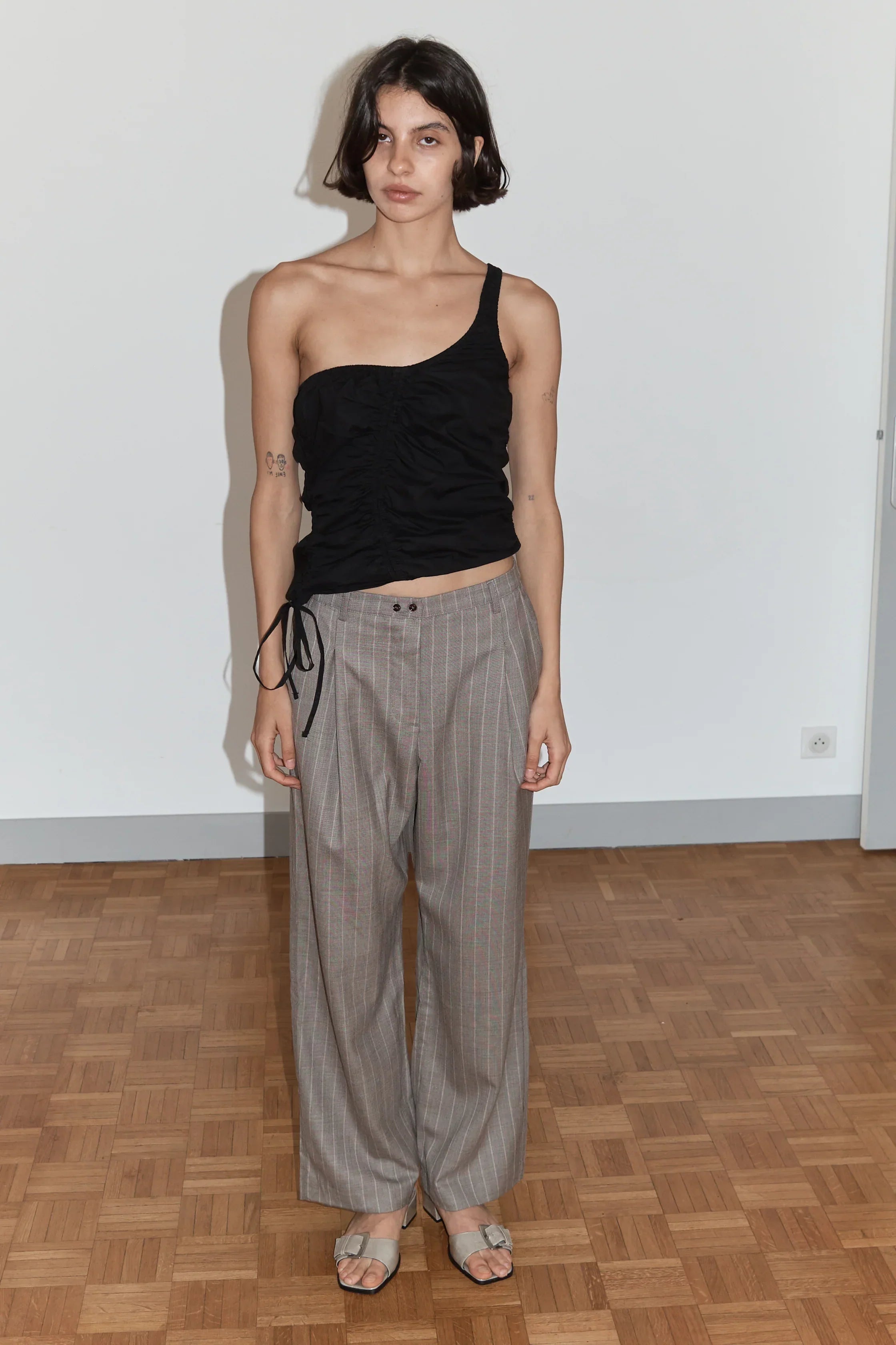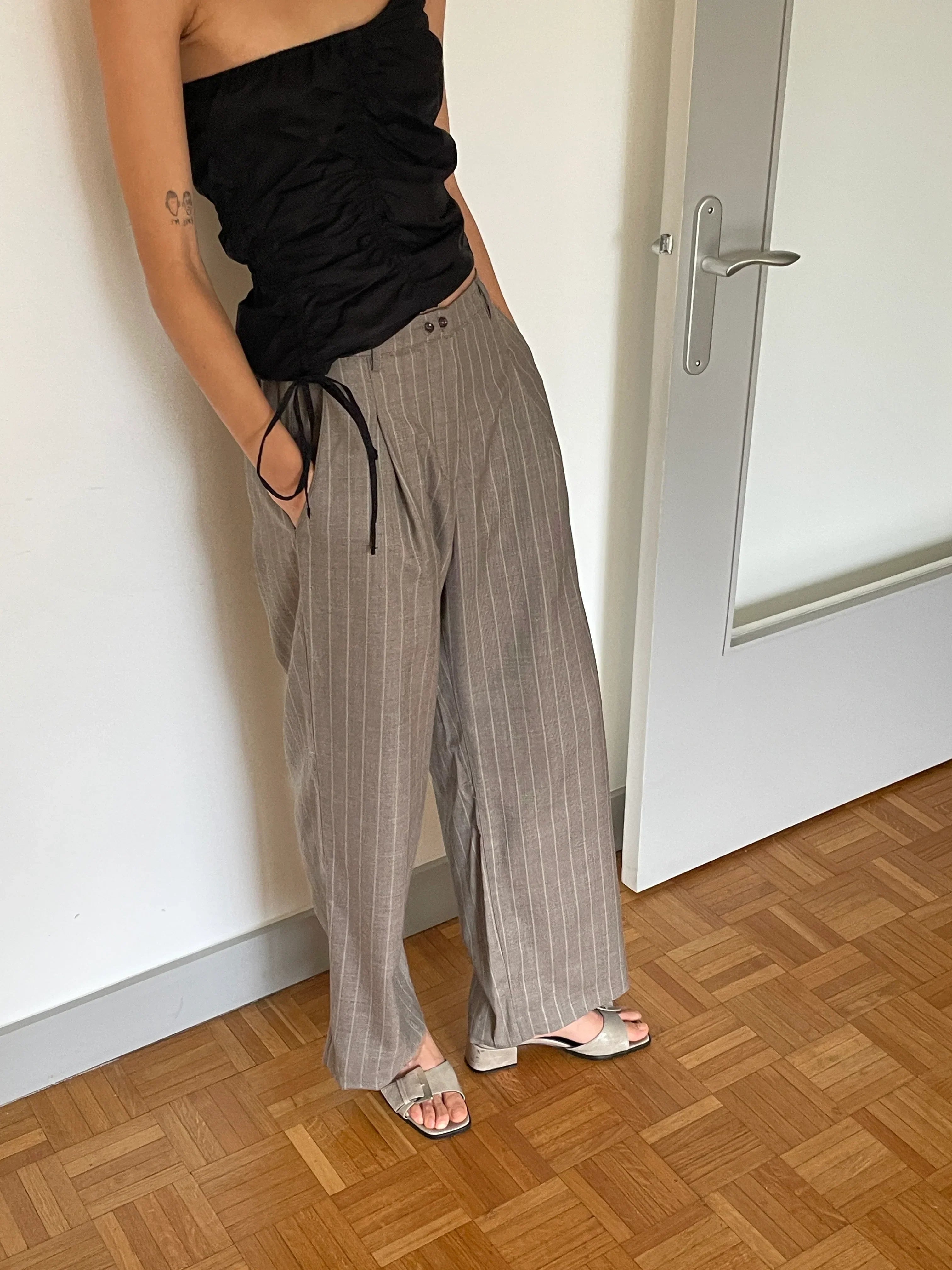 the twin button pant by Deiji Studios in pinstripe bark