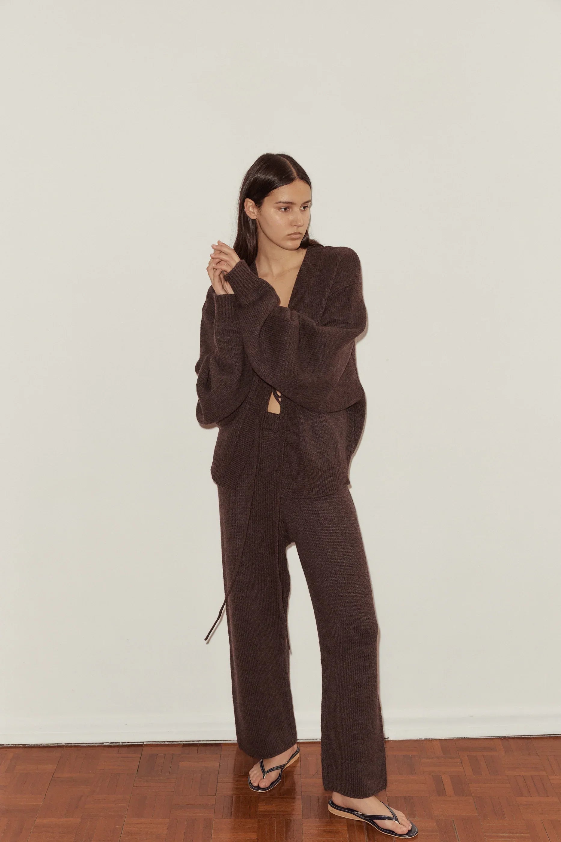 a mottled textured cardigan in a sustainable wool blend featuring a v neck front with two self fabric ties. dropped shoulder and a wide tapered arm for a relaxed look. ribbed hem and oversized fit for layering