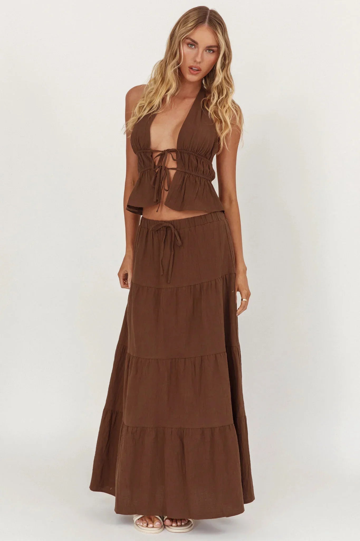 Dance the night away in our Under The Moons top. It features a halter design and ties in the front. It's perfect for Friday night with your girls teamed with its matching maxi skirt and western boots for an on-trend look we are loving.