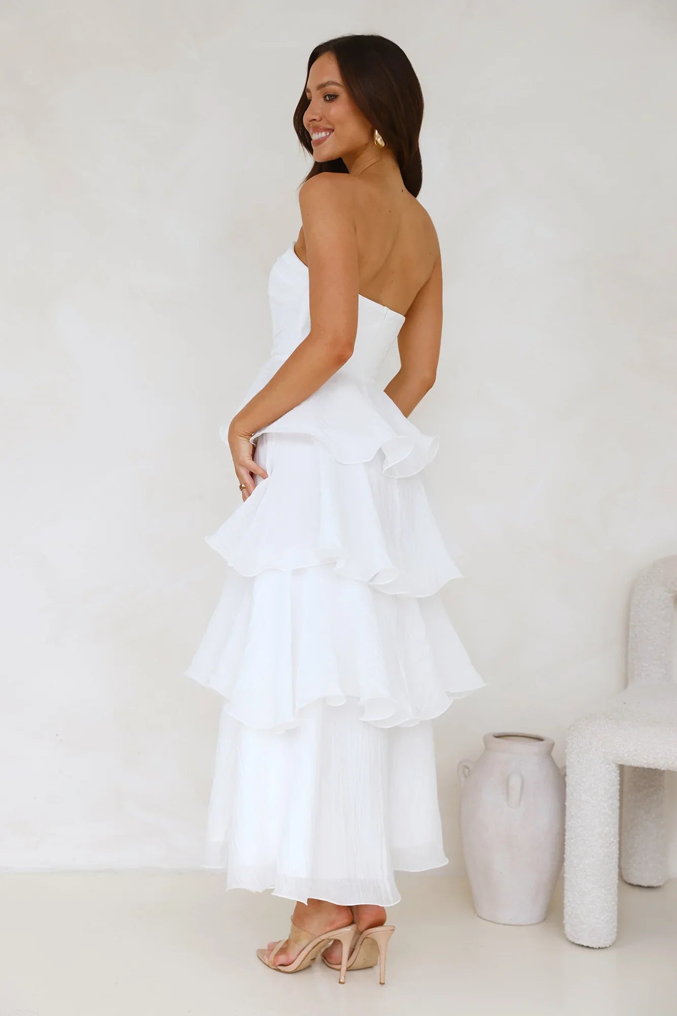 Lovely, we've got an extravagant style, just for you! The Wedding Adventure Strapless Maxi Dress features a tiered frill skirt, boning to the bodice and a gathered top. Style with heels and curls for a gorgeous 'fit.